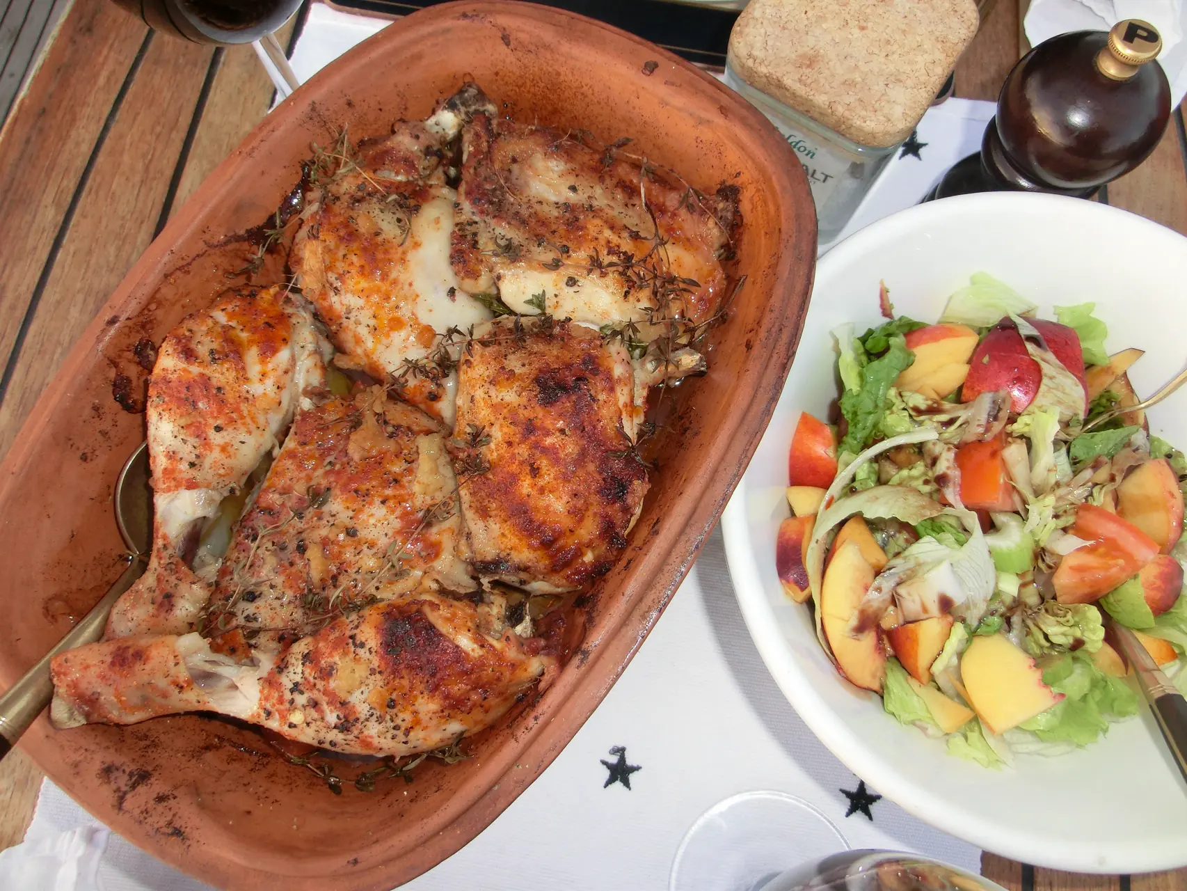 Fordel disse ingrediensene i den gjennomfuktede leirgryta og legg de oppdelte kyllinglårene på toppen. Krydre dem der med paprikapulver, salt og pepper.