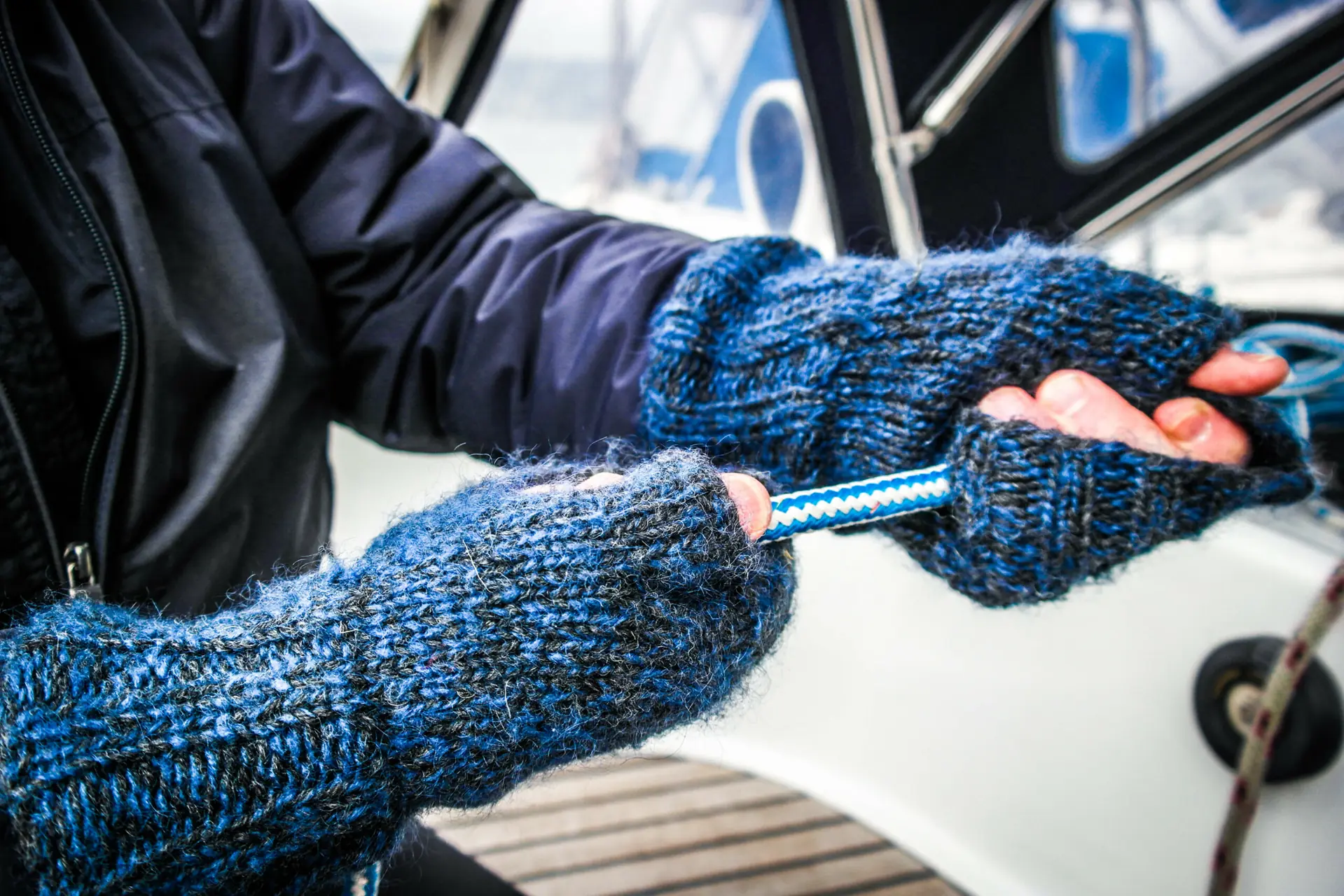 Jeg har også laget pulsvanter med forsterkninger av skinn mellom tommel og pekefinger. Fine for dem som driver med mye tauverk. Pulsvantene er gode på landjorda også. Fine gaver!