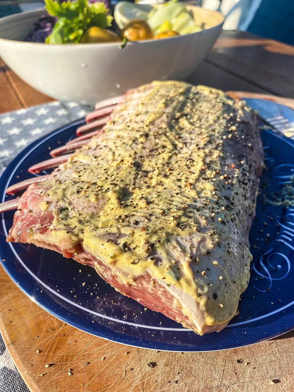 Dekk kjøttsiden med sennep, finhakkede urter, salt og pepper. Har du tilgang på friske urter, bruk det. Om du ikke har friske urter om bord; ta med deg friske urter hjemmefra. Hakk dem og oppbevar på glass. Du kan også bruke timian, ramsløk (kanskje du laget ramsløksalt i mai) eller pesto. Og urtene kan varieres.
