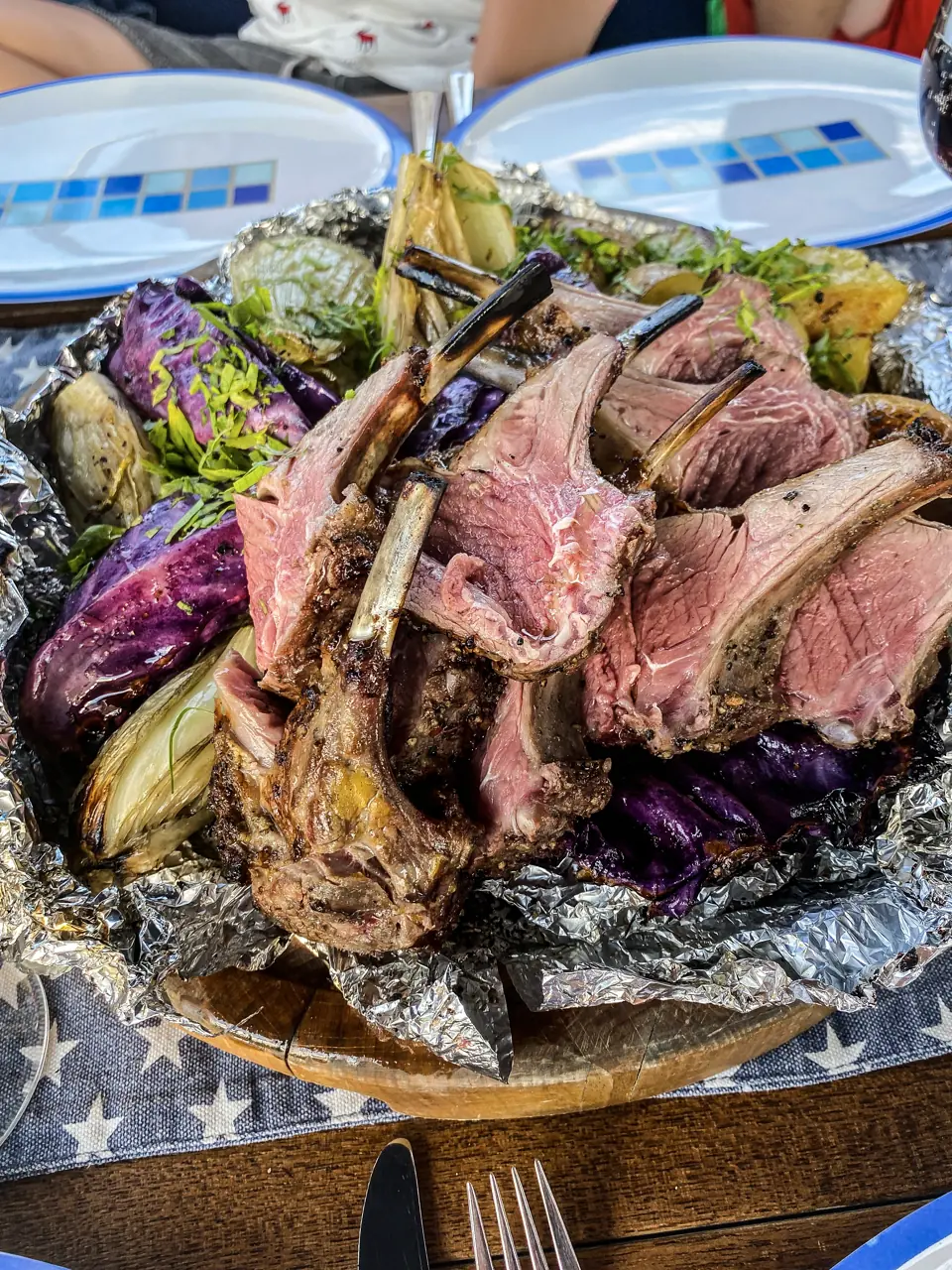La det hvile minst 10 min. før du skjærer opp og serverer. Rødkål og fennikel har fått plass på grillen mens kjøttet har blitt grillet.