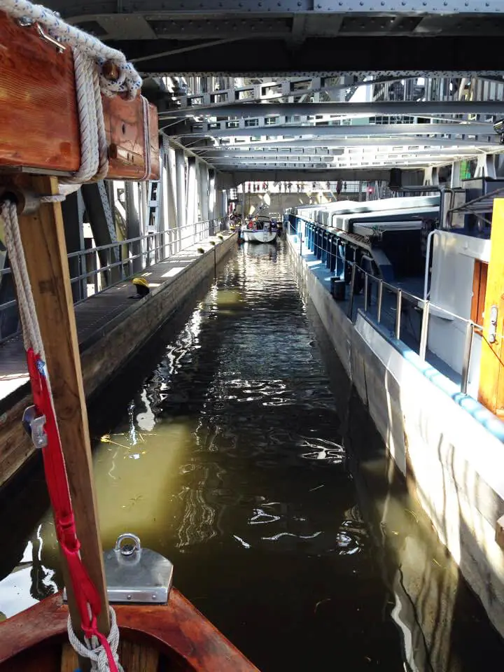 På et eller annet tidspunkt når du til høyeste sluse i en kanal, og da begynner det å gå nedover igjen. Dette kan være både enklere og vanskeligere, for noen ganger er slusen så full av vann at fenderne ikke når ned fordi de flyter opp.