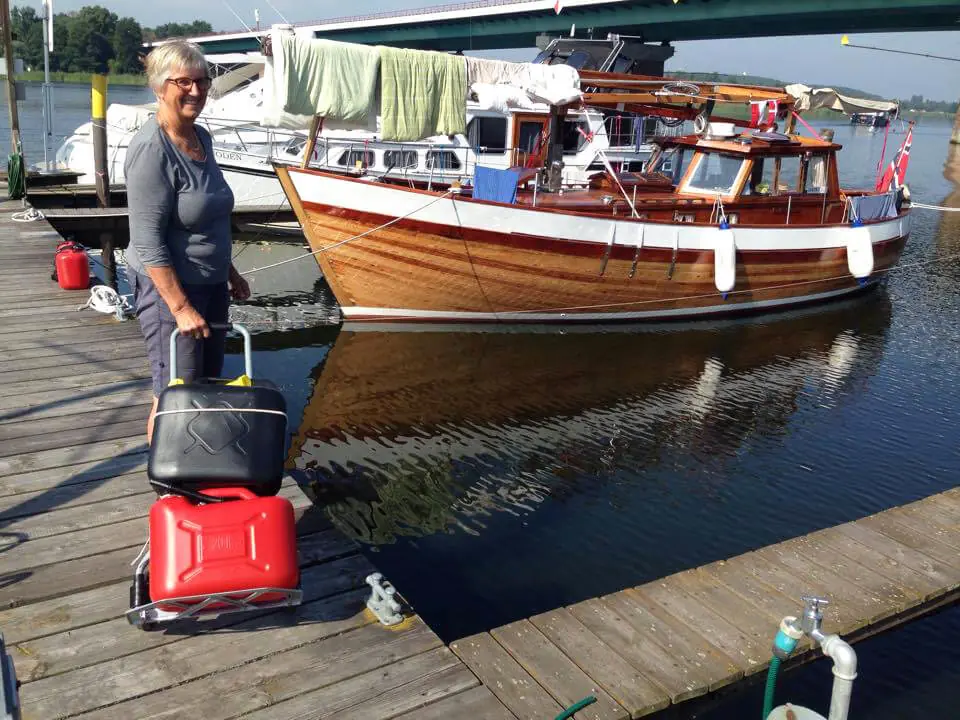 Hei! Nå er vi på Postdam-Havel kanal. På vei til Brandenburg. Ikke alle steder er det greit å gå inn til diesel påfylling. Da er tralle og kanner helt nødvendig. Ingen selvbetjening. Bare å vente på sjefen:-). I går gikk vi fra Spandau ved Berlin. Rett i sluse- ned 2 m. Alle sluser er gratis. Snitt på havneavgift i Tyskland er 12 euro. Med vennlig hilsen Sten og Inger Johanne.
