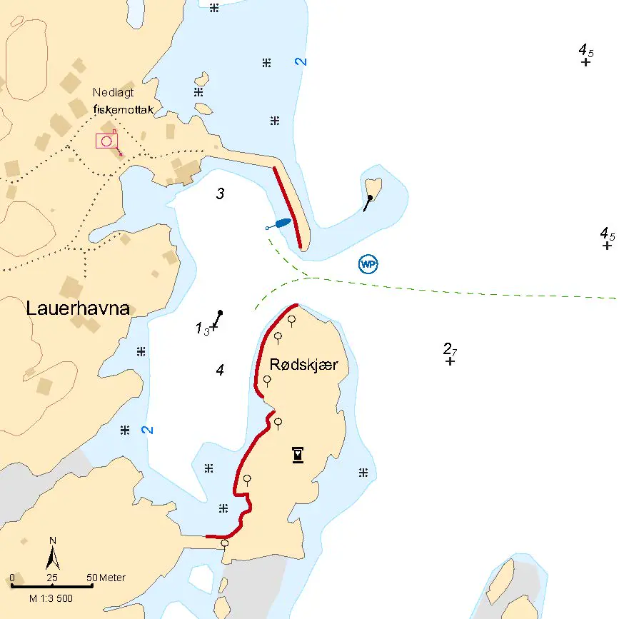 Molohavna på Nordre Lauer er trygg i alt slags vær. Du kan fortøye mot moloen i nord og med akterferste i én av de fem bøyene. De fleste velger imidlertid å fortøye longside på vestsiden av Rødskjær, og her ligger ofte flere båter utenpå hverandre. Dybdene inn til fjellet er gode, og det er bra med bolter å gjøre fast i.