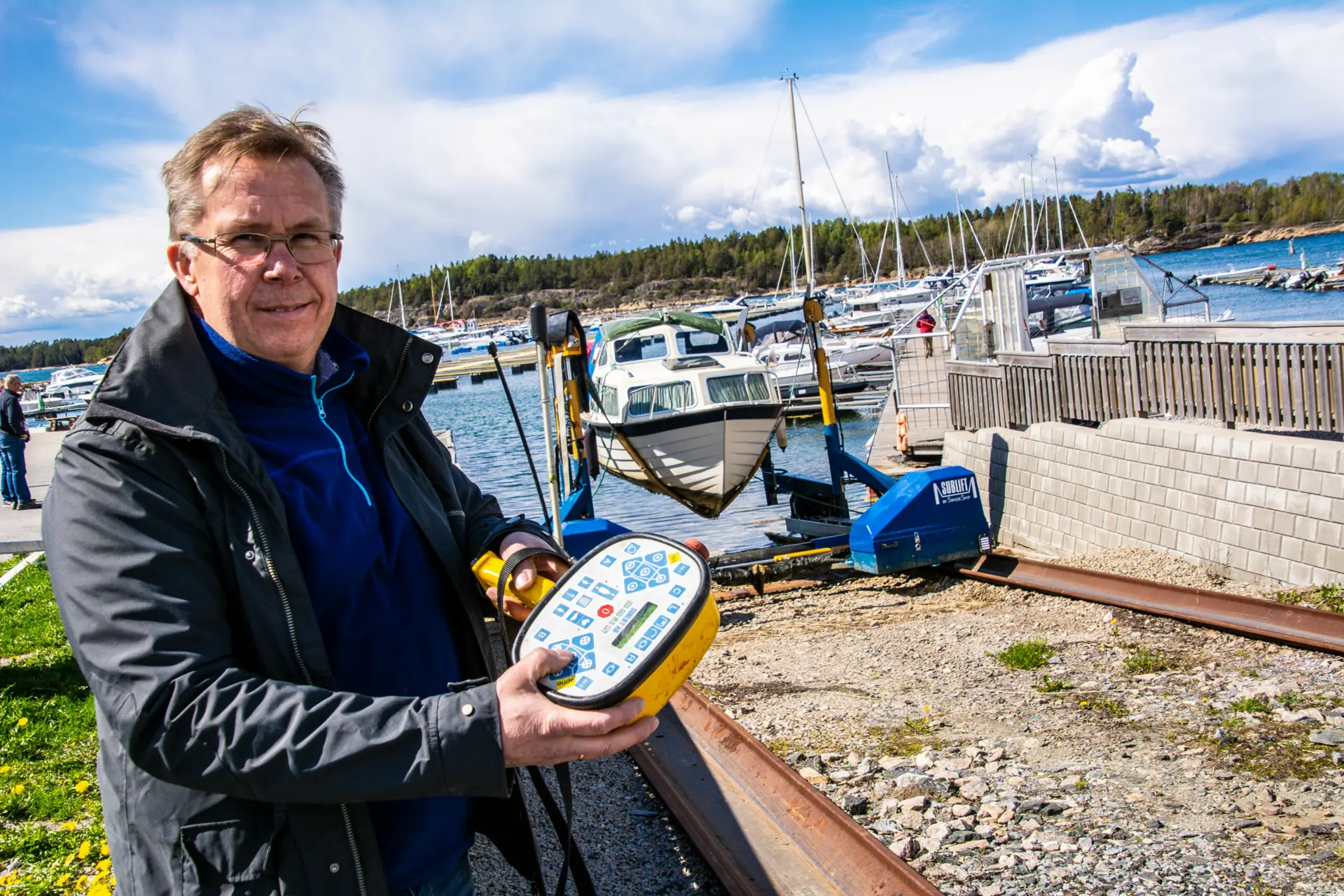– Den løfter båtene veldig skånsomt og forsiktig, og vi har svært få skader ved opptak. Vi kan stable veldig tett, og vi slipper flere operasjoner. Her kjører vi liften rett ut i sjøen, løfter opp båten og kjører båten på plass i liften. Alle de fire armene kan justeres slik at vi får akkurat den høyden og vinkelen vi ønsker, og liften kan breddereguleres i forhold til båtstørrelse. Det eneste vi måtte gjøre var å få bygget og tilpasset en skrårampe ut i sjøen. Vi har seks kranførere som er kurset i bruk av liften, og i starten gjorde leverandøren dette. Nå tar vi kursingen selv. Under opptak må kun kranfører og båteier være her, og vi får mye bedre fleksibilitet.