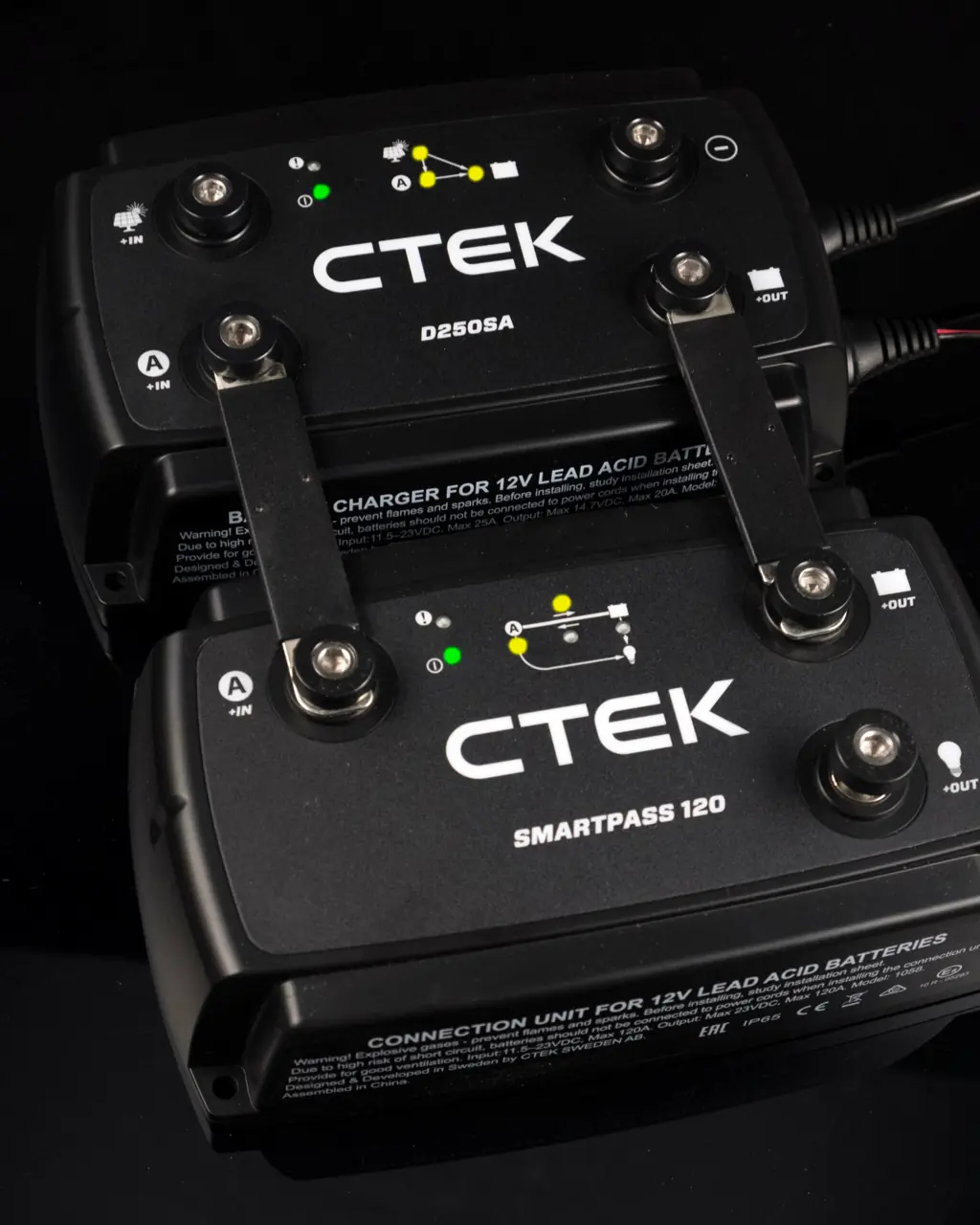 Optimalisering av lading: Lykken uten landstrøm! Systemet består av to ladere, D250SA og Smartpass 120. Begge kan brukes for seg selv, men sammen er de ekstra smarte. Prinsippet er at man ved avansert teknologi optimaliserer ladingen fra dynamo, slik at man oppnår effektiv lading selv på korte turer. Systemet har en mengde intelligente funksjoner for å ta best mulig vare på både start- og forbruksbatteri og for å redusere strømforbruk. Noe som er veldig smart, er at det er mulig å koble til alternative ladekilder fra solceller eller vindgenerator Når solcellepanelet kobles til D250SA, trenger man ikke å bruke egen regulator, som ellers er påkrevet. Når motoren går lades batteriene både fra dynamo og solcellepanel - når man har fortøyd bare fra solceller. Systemet er ganske dyrt, du må ut med rundt 6 tusen kroner for hele pakken – men du kan kanskje spare en ødelagt batteribank. Systemet sikrer også startbatteriet.