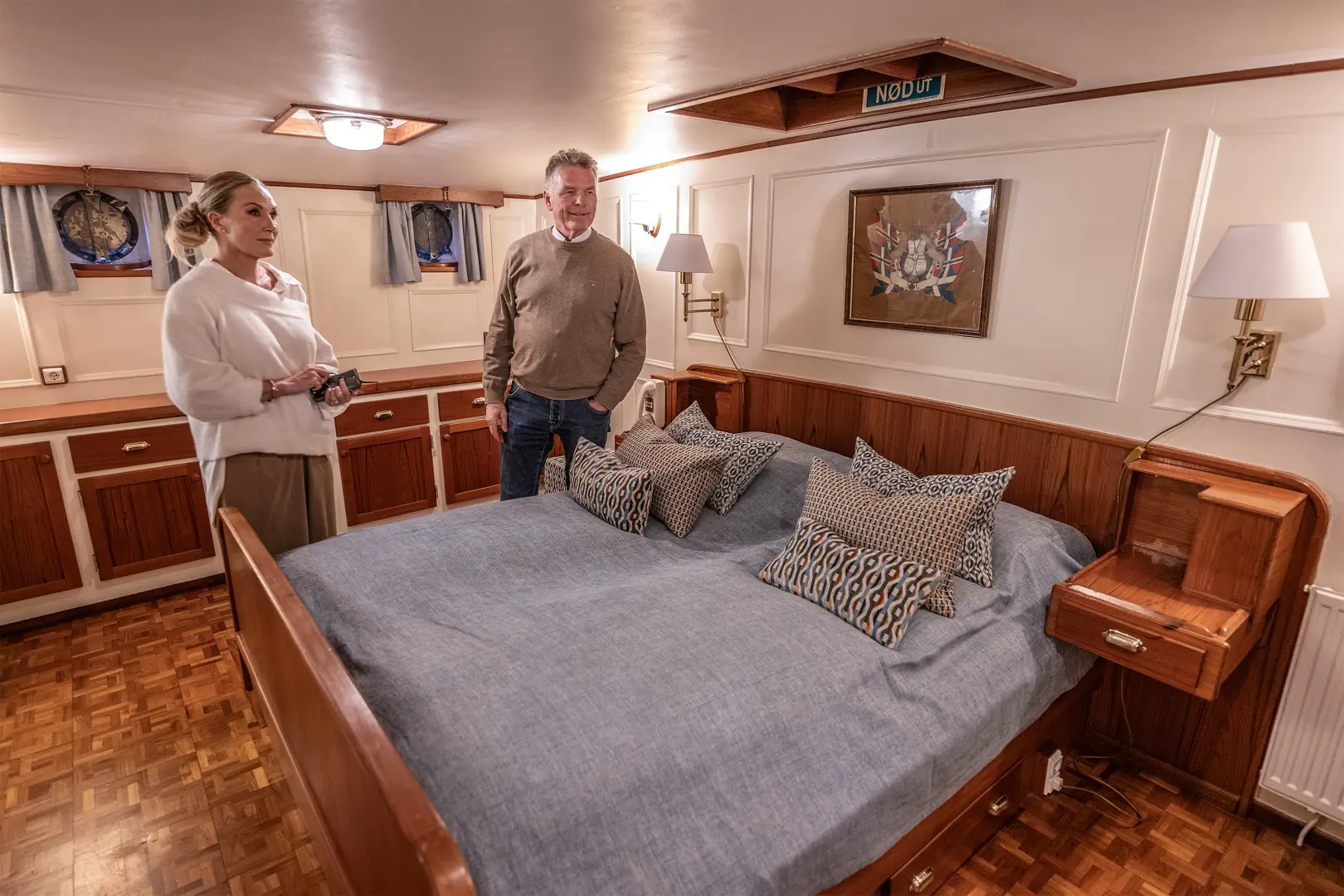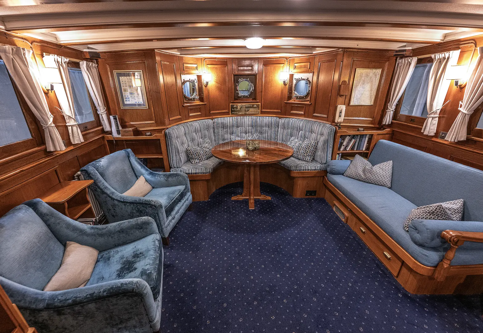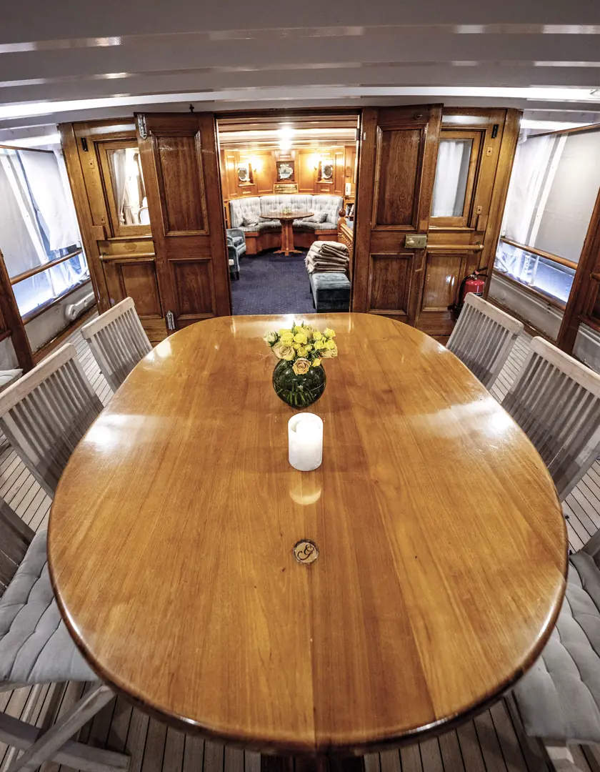 Med et fast mannskap på fire dekkes det elegant til 12 gjester til en flere retters middag, som senere kan innta kaffe i aktersalongen, eller på akterdekket. Ved bufféservering er komforten for 24 gjester slik den bør være på en slik staselig båt. På overnattingsturer er det fem lugarer med plass for åtte gjester.