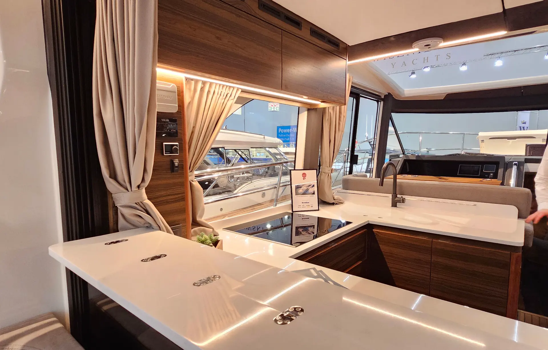 Videre inn er hjertet i båten for «kokken», pantryen, som er helt enestående for dem som skal stå for matlaging. Med fokus på plass, masse kjøle- rom og skuffer, dobbelvask, komfyr og alt hva man behøver for å trylle frem de beste retter.