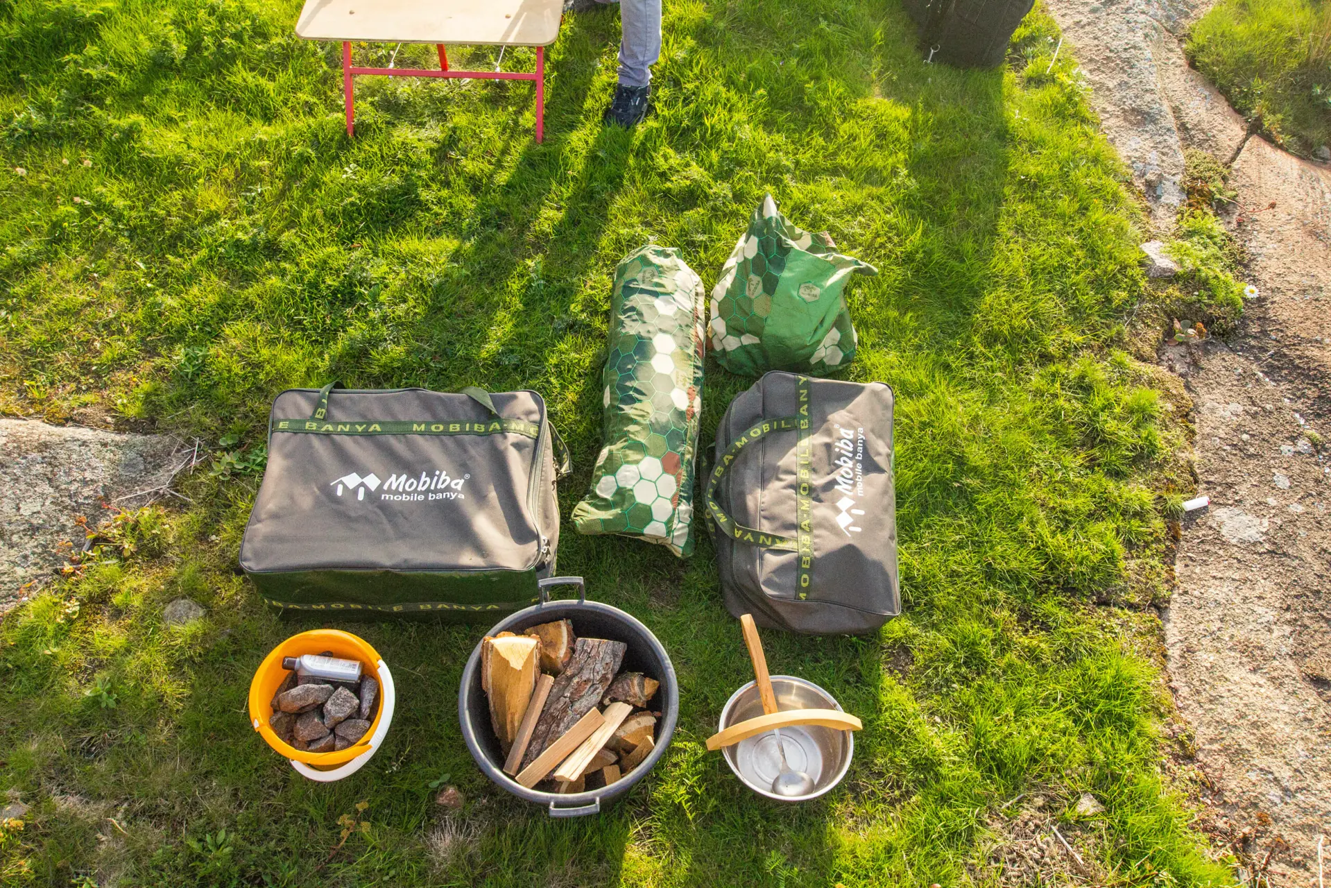 I følge Mobiba kan vi i vårt telt oppnå temperatur på opp til 120 grader med tørr ved. Vi får nøye oss med 60 og 70 grader før vi må ta «time-out». Vel fortøyd og ankret opp ved en holme med flatt terreng, pakker vi ut av bagen. Aluminiumsrammen gjør at vi slipper å være avhengige av teltplugger og barduner under riggingen, men noe må selvsagt teltet festes i – spesielt for sikkerheten. Etter cirka ti-femten minutter er telt med ovn oppe og stå, og neste gang skal tiden halveres. I følge importør Roman skal det ikke ta mer enn fem minutter å få badstua opp og stå.