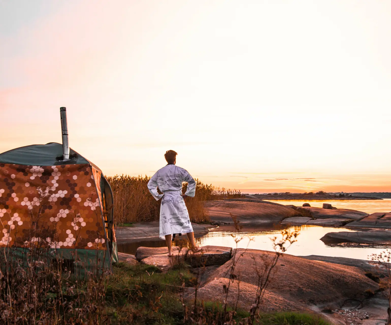 Med noen vedkubber i ovnen fyrer vi opp og venter noen minutter. I teltet er et stort vindu på en av veggene, og vi ser det skjer noe i teltet. Temperaturen stiger og røyk siger opp fra den lille pipen. Det hele virker nesten litt komisk. På en øde øy har vi altså plutselig fått vår egen, finske sauna på 3,6 kvadrat.