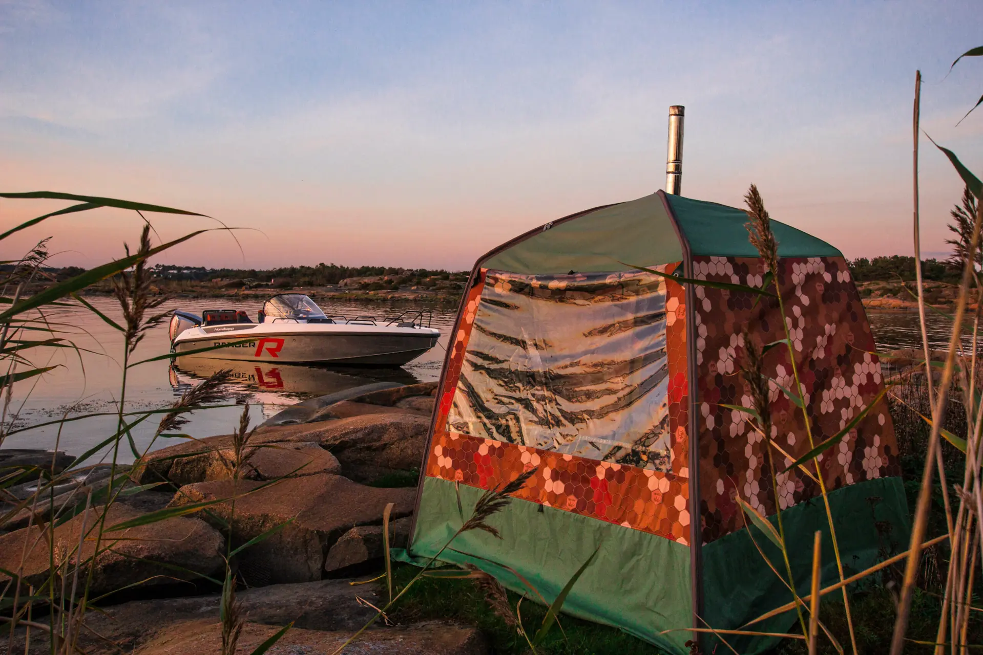 Det sier seg selv at det å ha med en egen badstue på båttur ut i skjærgården selvfølgelig tar litt plass, men når alt kommer til alt er det ikke så vanskelig. Mobiba MB-10 består av et telt som settes opp med vanlige stenger og plugger, som hvilket som helst annet telt, samt en rustfri, vedfyrt ovn. Begge enhetene kommer i bager, og vedovnen veier 18 kilo, mens teltet er på fem kilo. Vi tok med teltbadstua på tur med en Nordkapp Enduro 705 Ranger. Om bord stuver vi noen vedkubber, rent vann på flasker, de to bagene, en bøtte med badstuestein og en dampgenerator. Med sistnevnte kunne vi sløyfet den ti kilo tunge steinbøtta – men for testens skyld tar vi med begge. Vi tar også med en sammenleggbar benk til å ha i teltet. Nå er vi klare for tidenes spaopplevelse en høstkveld.