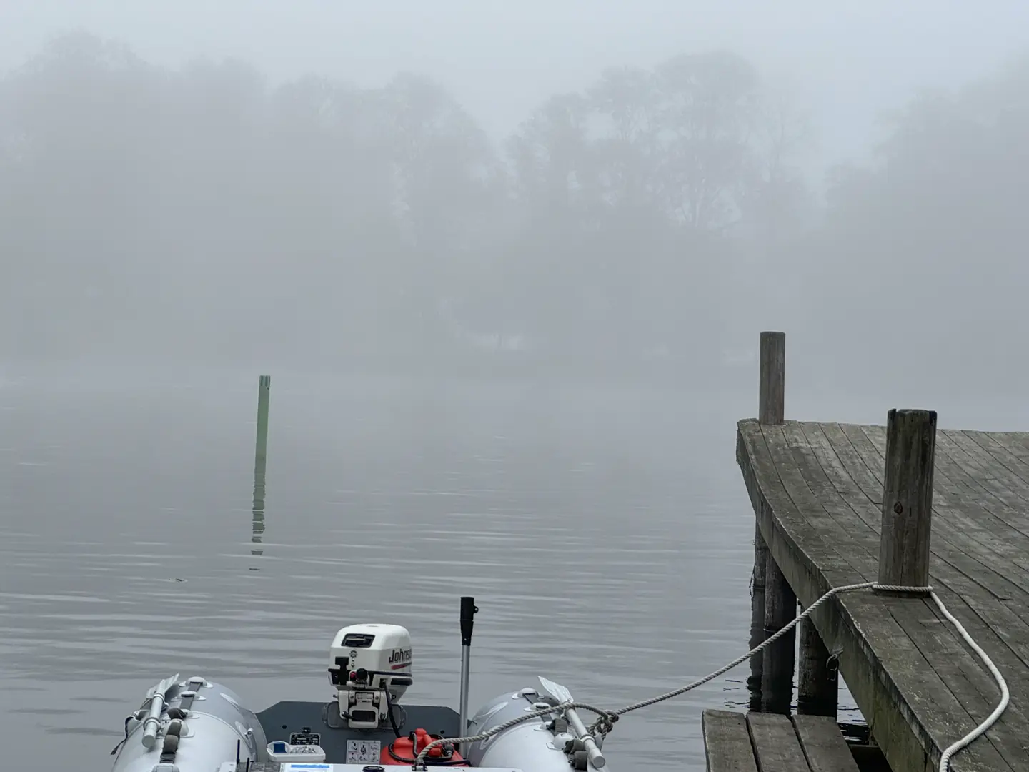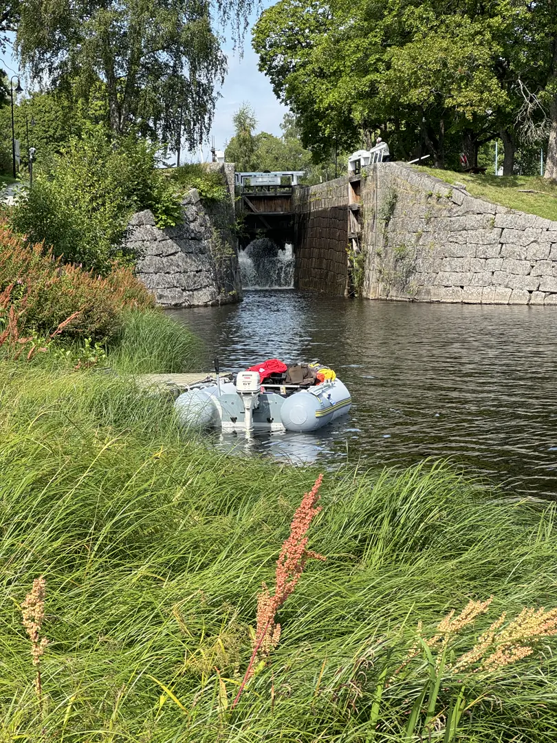 Tredje døgnet på kanalen, våknet vi til tykkeste morgentåken - og vi kunne ikke bevege oss ut med Zodiac'en på innsjøen Barken. Dermed måtte vi avblåse det avtalte tidspunktet ved slusene. Vente ett døgn, var ikke aktuelt. Vi pakket sammen, og tok avgjørelsen med å avblåse slusene - og forflyttet oss ned til Mälaren.