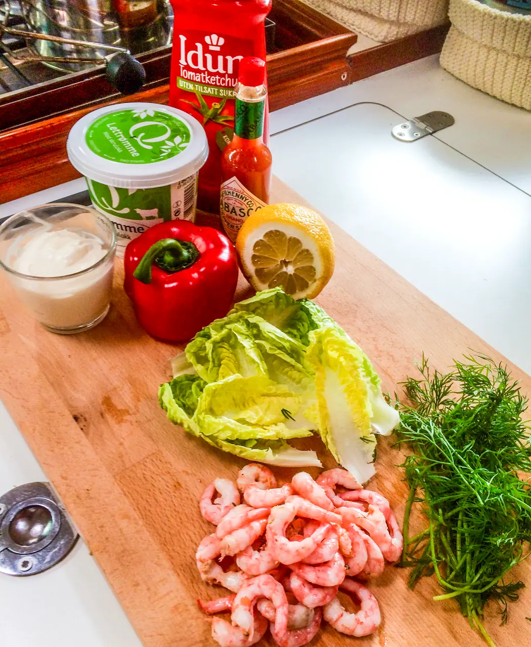 Jeg regner 500 gr reker pr. person. Da blir det alltid noen igjen. Ikke kast disse på sjøen sammen med rekeskallet (som du vel venter til kvelden med å la skli forsiktig ned langs skutesiden, så du slipper skrikende måker?). En liten dugnad med rekeskrelling belønnes med ingredienser til neste dags forrett:
