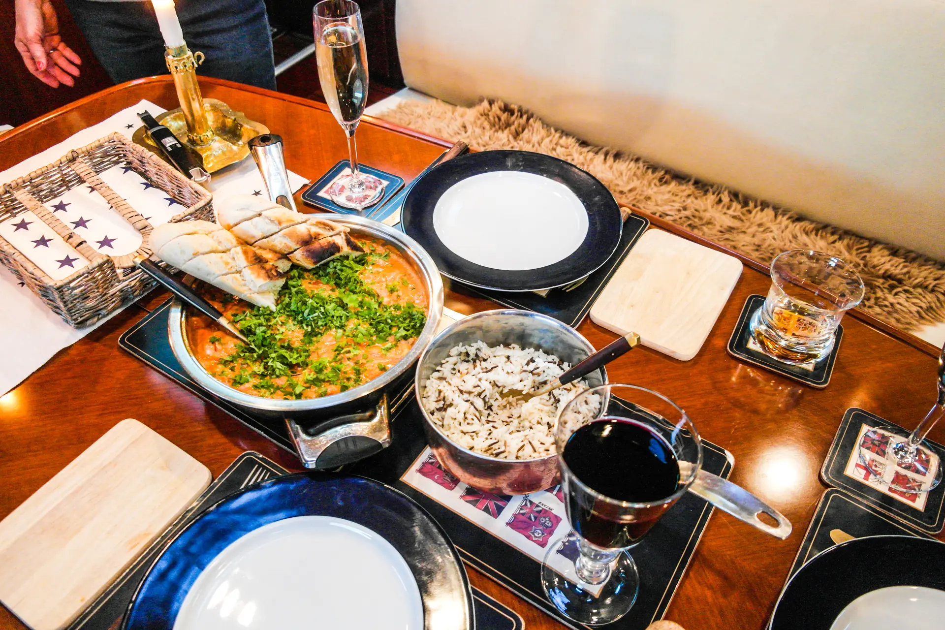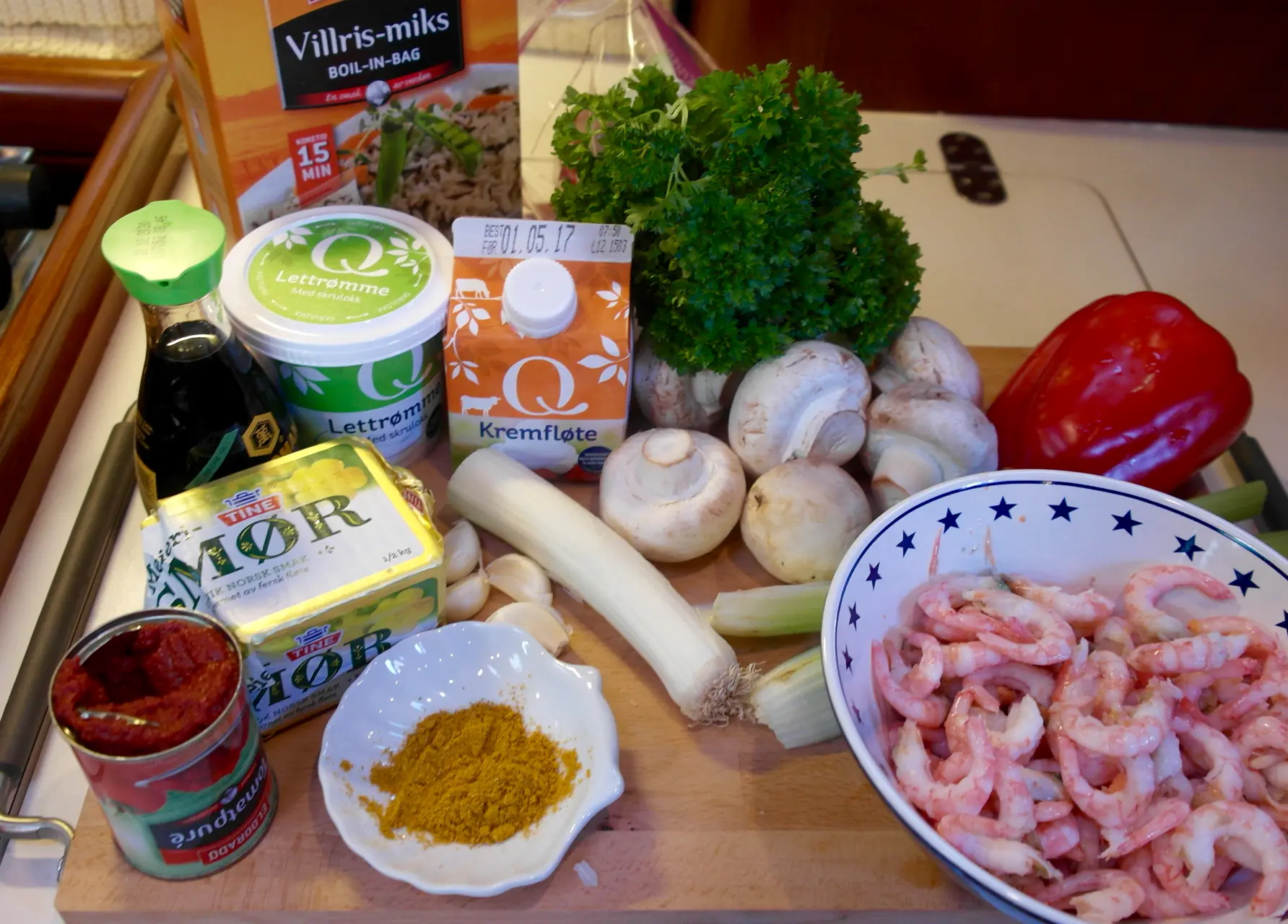 10 - 12 minutter. Ikke la grønnsakene bli for møre. Ha i soya, tomatpuré og fløte og gi et oppkok. Ha i rømme og rekene og varm raskt opp. Unngå koking etter at rekene er tatt i. Smak til med sellerisalt, sherry eller cognac. Strø masse finhakket (klippet) persille over ved servering. (Jeg dytter persillen i en kopp og hakker ved å klippe med en saks i koppen) Server med ris og, eller ferskt brød, gjerne hvitløksbaguetter. Jeg har hørt at det ikke er helt stuerent å bruke «boil-in-bag»-ris, men hos oss er det tillatt. Eldorados Villris-blanding er kjempegod. Da er det bare å ønske velkommen til bords, og det smaker like godt med hvitvin som rødvin til.