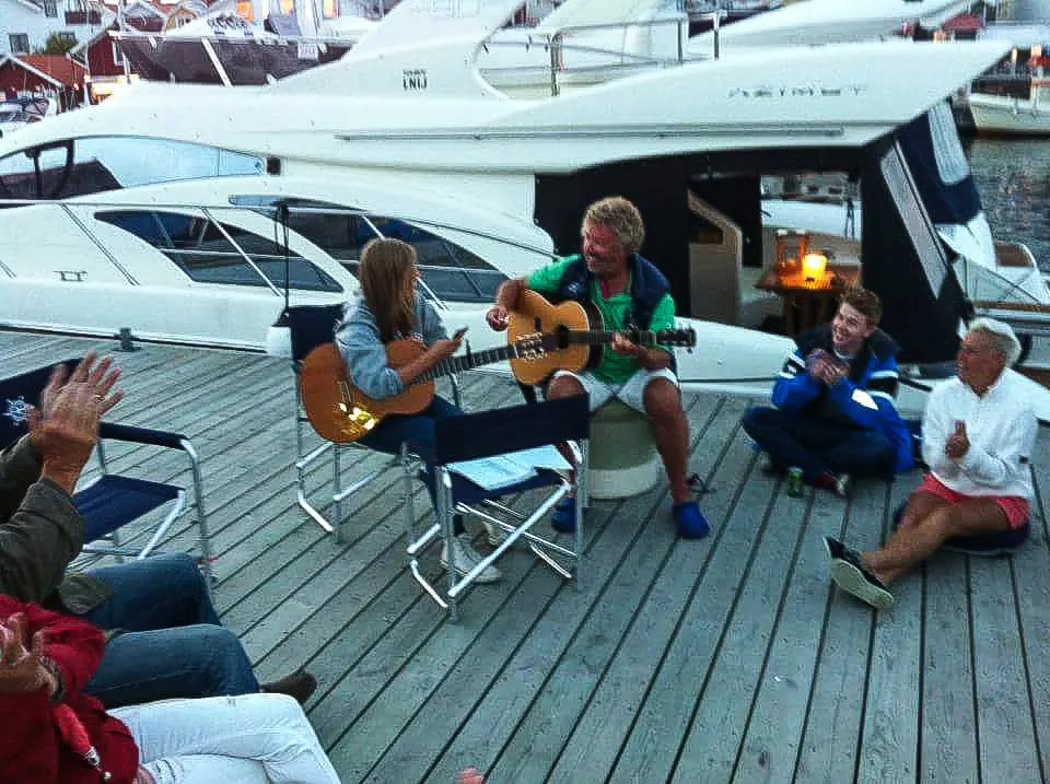 – Båtnaboer merker helt klart at jeg er ombord! Jeg skriver låter eller øver daglig på båtferien også, og sitter helst oppe på flybridgen og soler meg litt samtidig. Så det er nok mange som både frivillig og ufrivillig må høre på! Heldigvis pleier det å bli positivt mottatt, så det ender gjerne med «bryggekonserter» i de ulike havnene hvor alle som ønsker sosialt samvær og musikk, tar med seg et glass vin og en stol og samles i en stor klump midt på brygga på sommerkveldene. Da er det virkelig stemning å dra frem alle de svenske Taube- og Vresvjiik-visene jeg har lært i barndommen, for det er virkelig ikke en bedre setting å spille disse på, enn akkurat da, forteller hun.