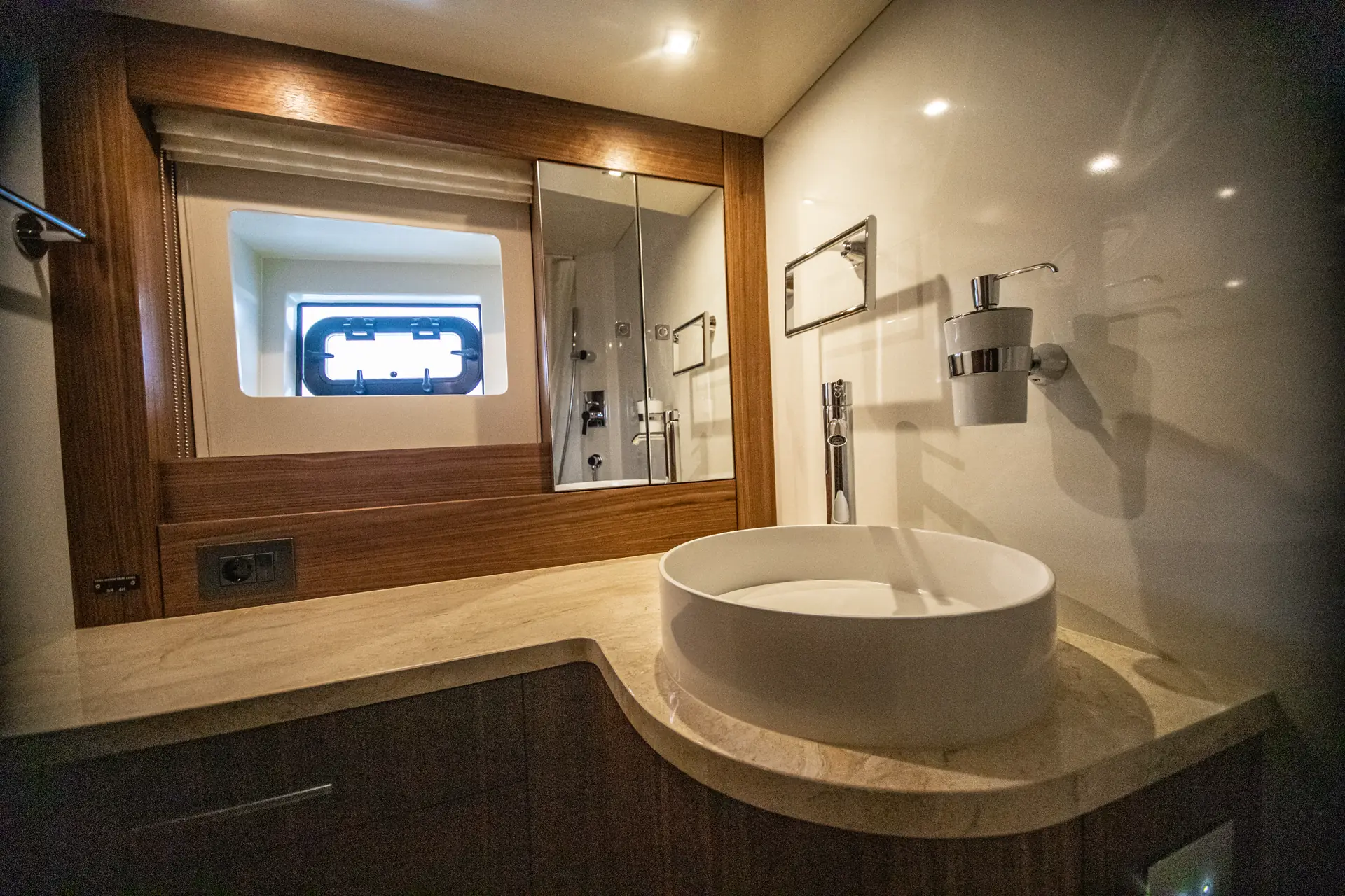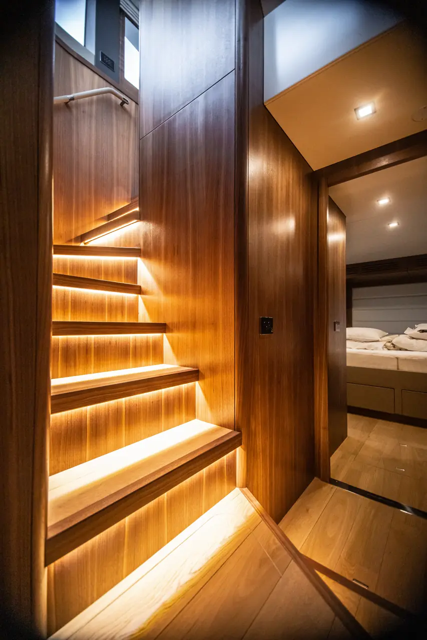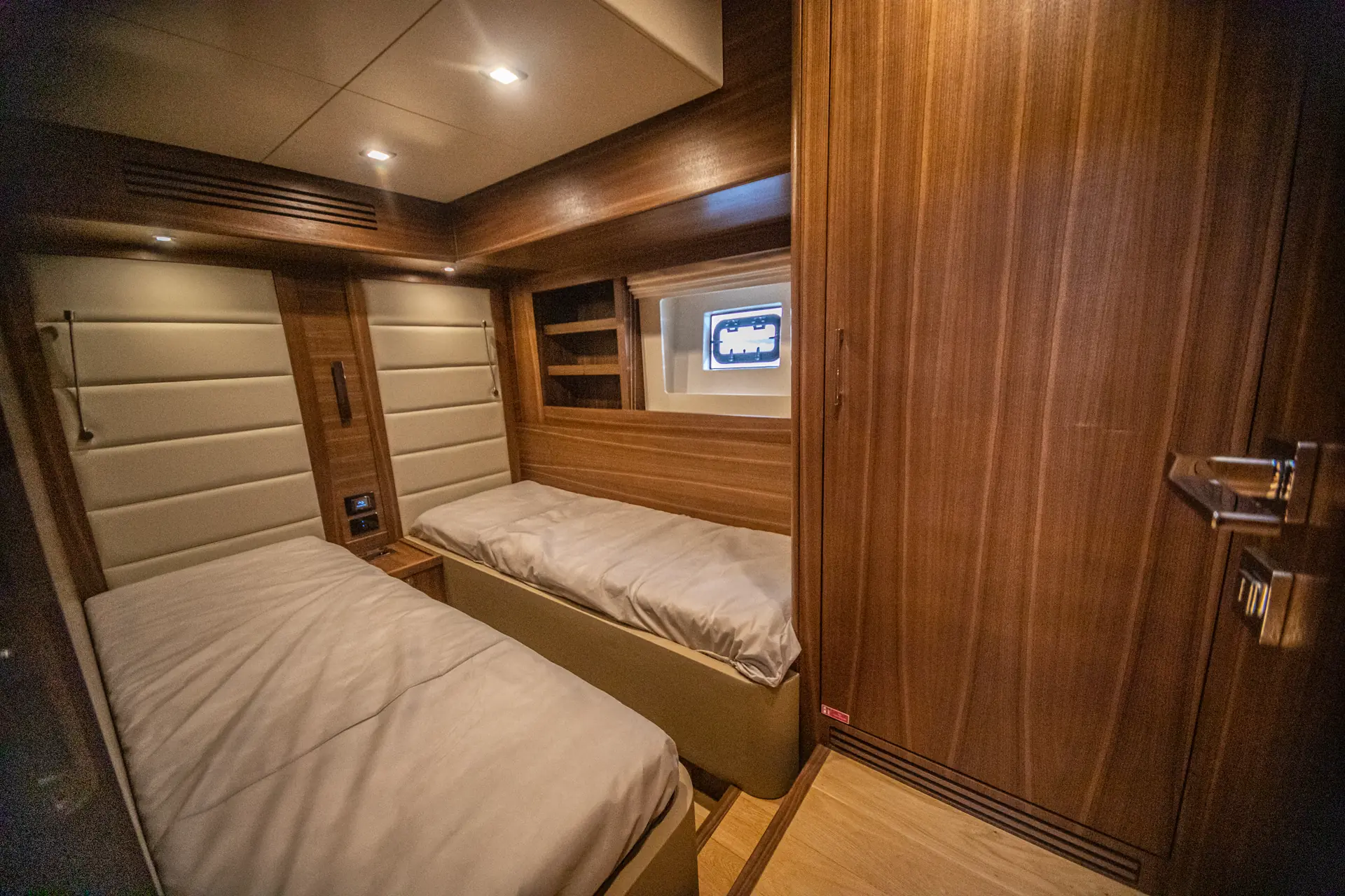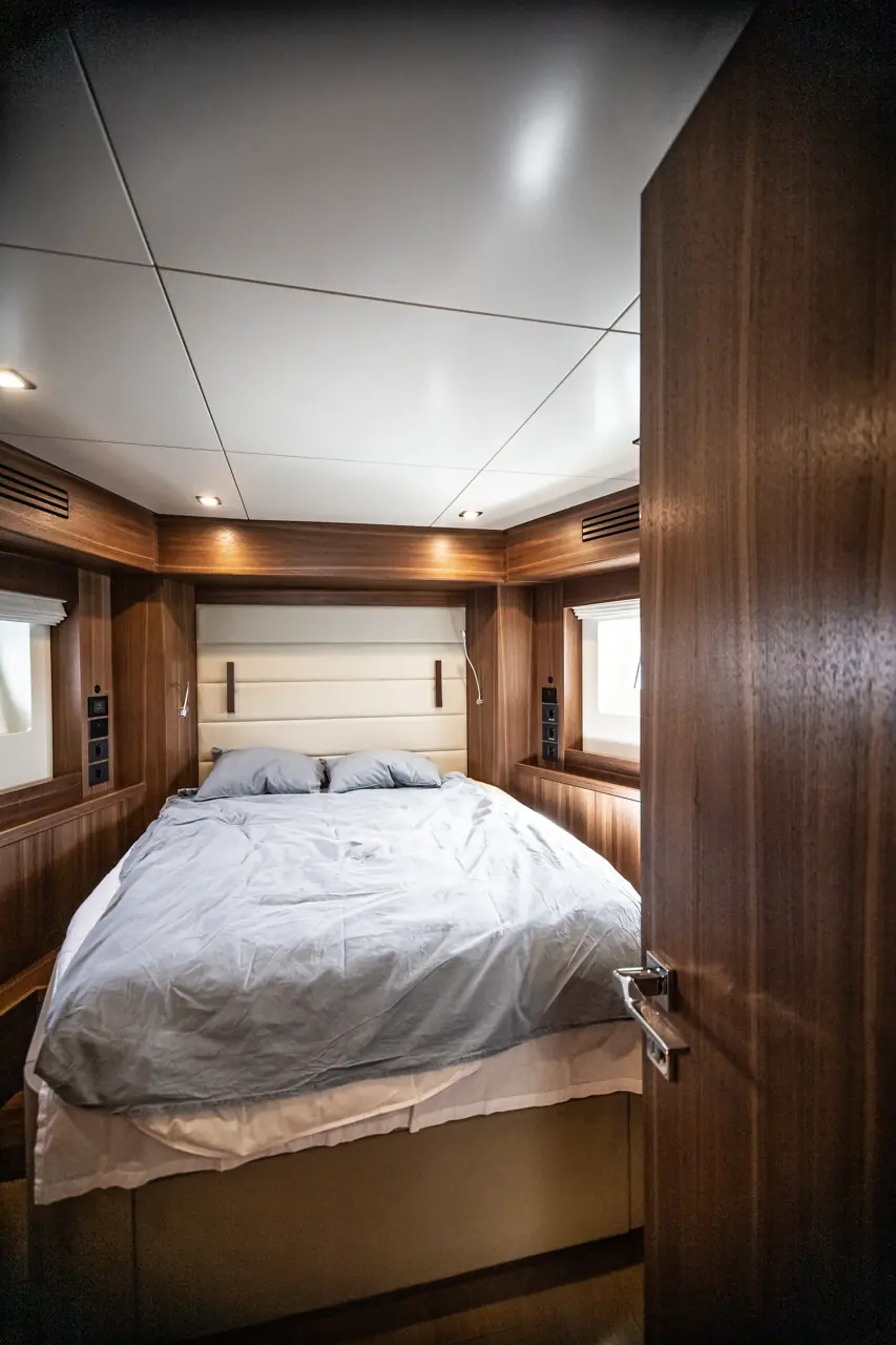 Master cabin midtskips er nok den mest imponerende, med store skrogvinduer i sidene, full takhøyde, sminkebord og arbeidsbenk, samt reelle skap- og skuffer. Naturlignok opplever vi litt mindre lagringsplass i sidekabinen. Kabinene er lyse og luftige, med tredørk og eik treinnredning. Varme kommer fra en Kabola fyrkjele med individuelle termostater i hver kabin og i flere av de sosiale sonene om bord.