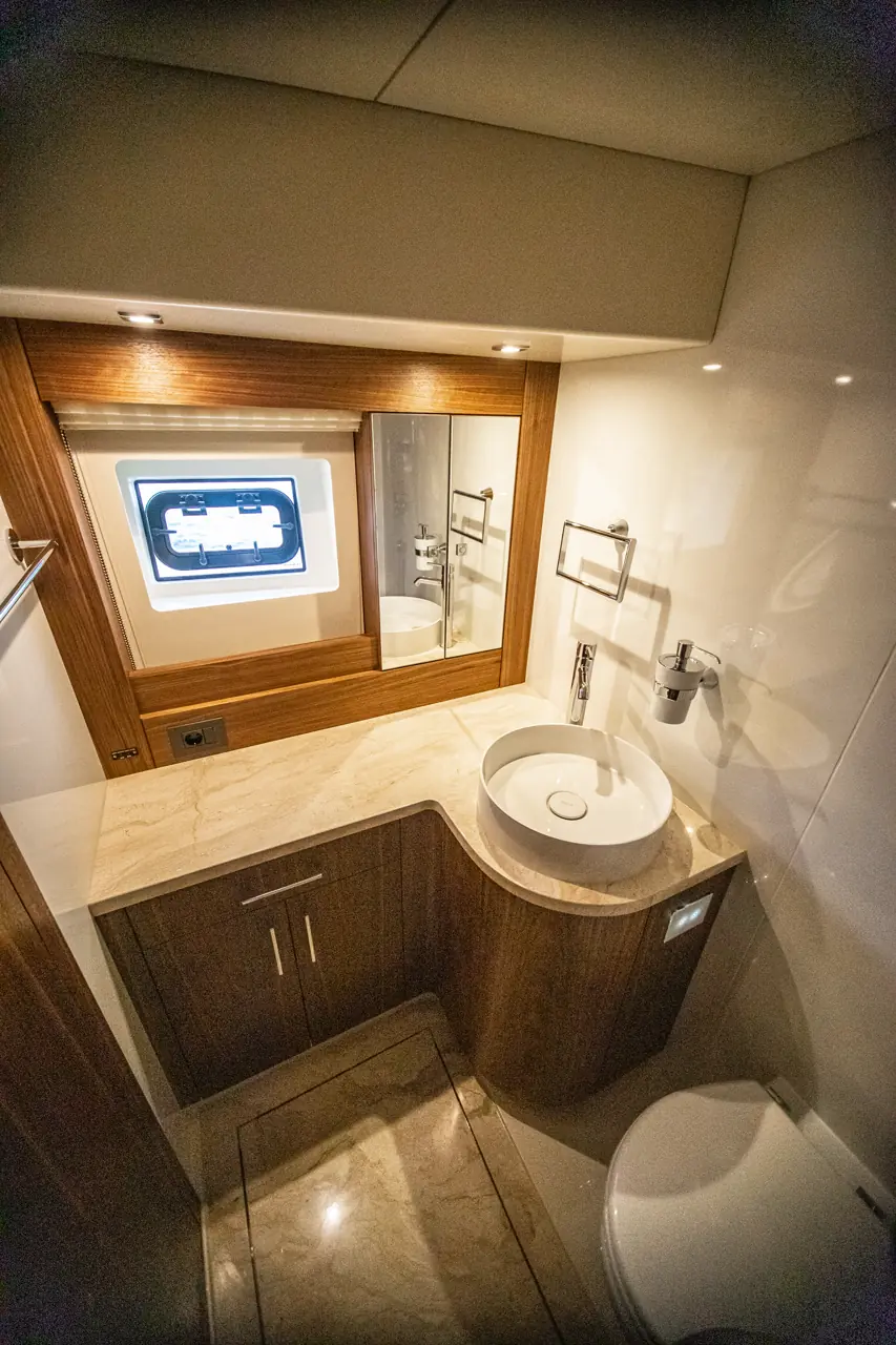 Under dekk kommer båten med tre layouter. Vår testbåt har en stor eierlugar midtskips med bad, en kabin med to senger og toalett, samt en lugar forut med dobbeltseng og eget bad. Du kan også få båten med to lugarer og masterkabin forut med egen utgang til fordekk. Badene har ekte marmor på dørken som opsjon og oppleves som overraskende romslige med både takdusj og godt med lagringsplass.