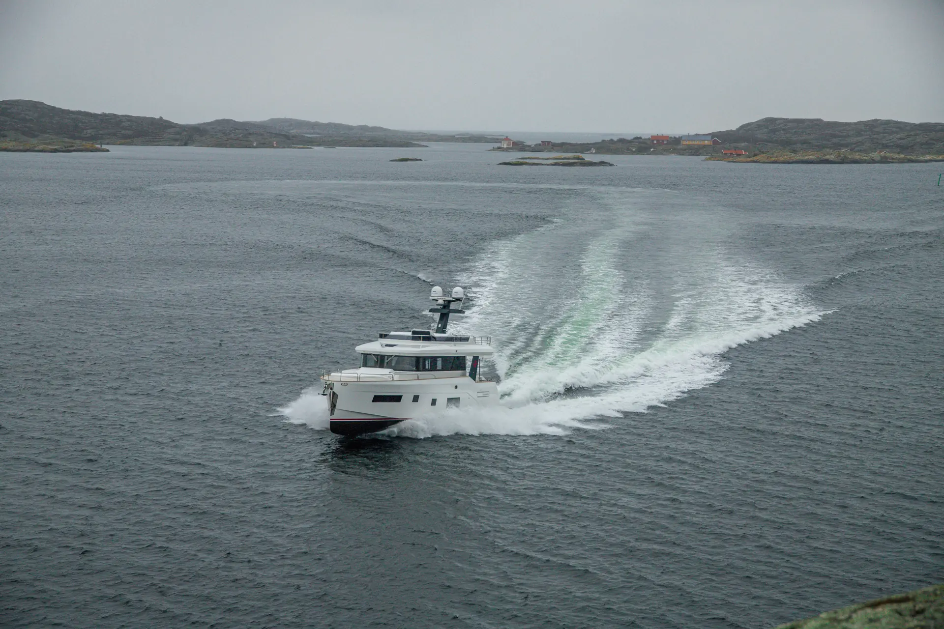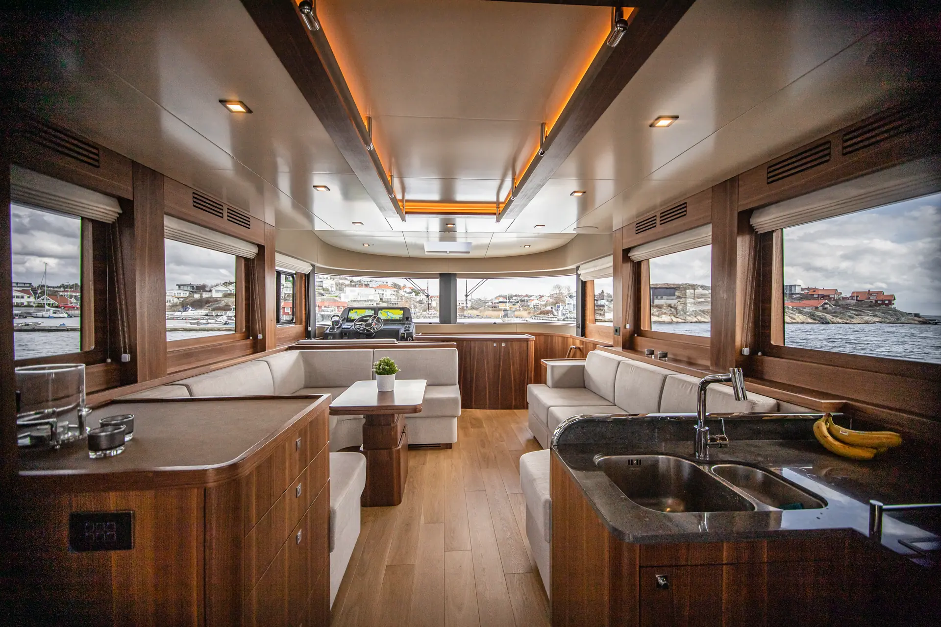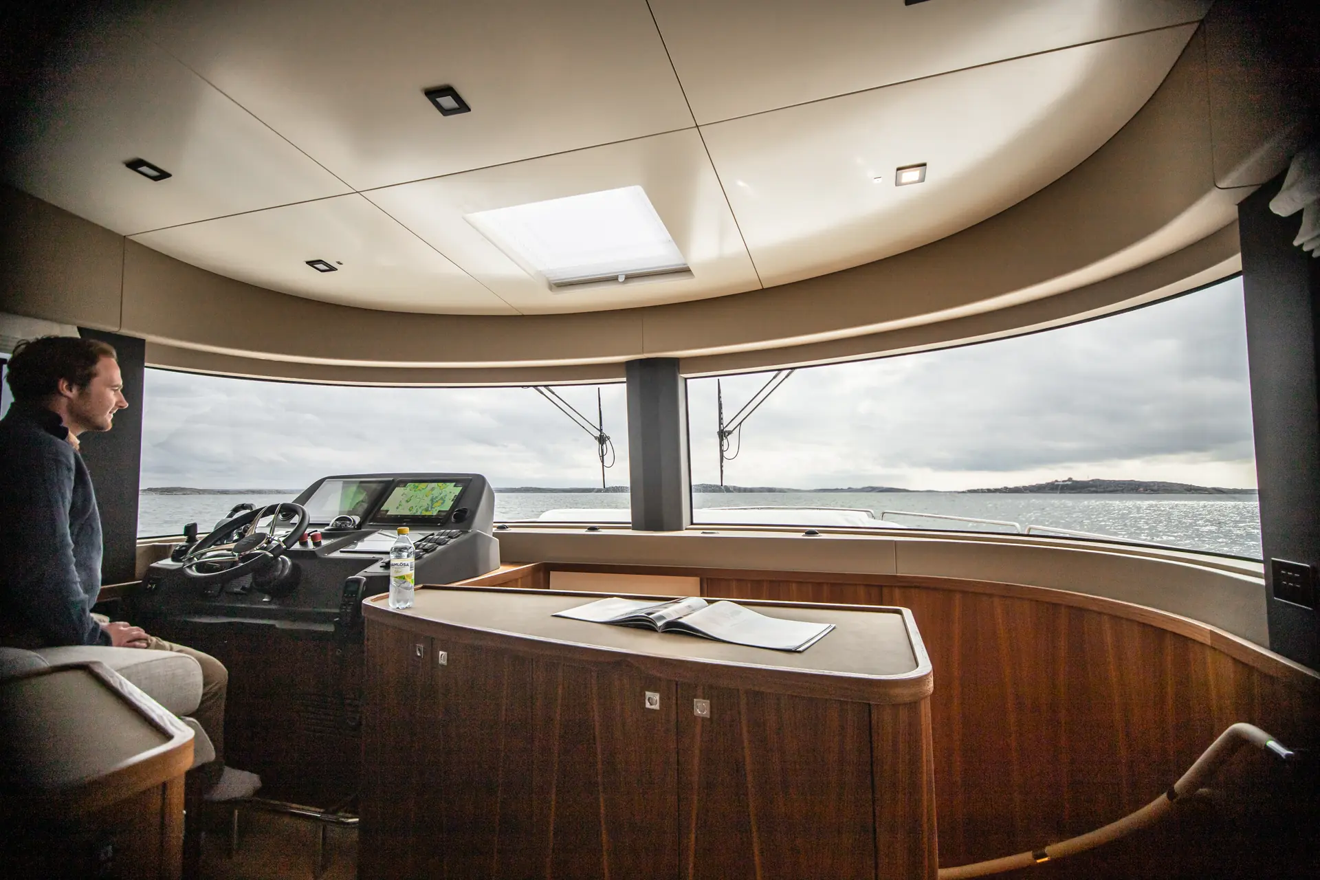 Velger du å bruke førerposisjonen innendørs sitter du langt fremme i båten på babord side og har god oversikt fra baug til akter. Takket være at frontrutene har rett vinkel blir det også bedre plassfølelse her. Den har også et smart skyvevindu slik at du får bedre oversikt, men også kan håndtere gass/gir, joystick og thrustere fra dollbordet utenfor hvis det skulle være nødvendig. Du kan også få skyvedør ut til dekket på motsatt side, som det solgte eksemplaret i Florø har. Vår testbåt er godt utstyrt, og har også førerposisjon utendørs på akterdekket.