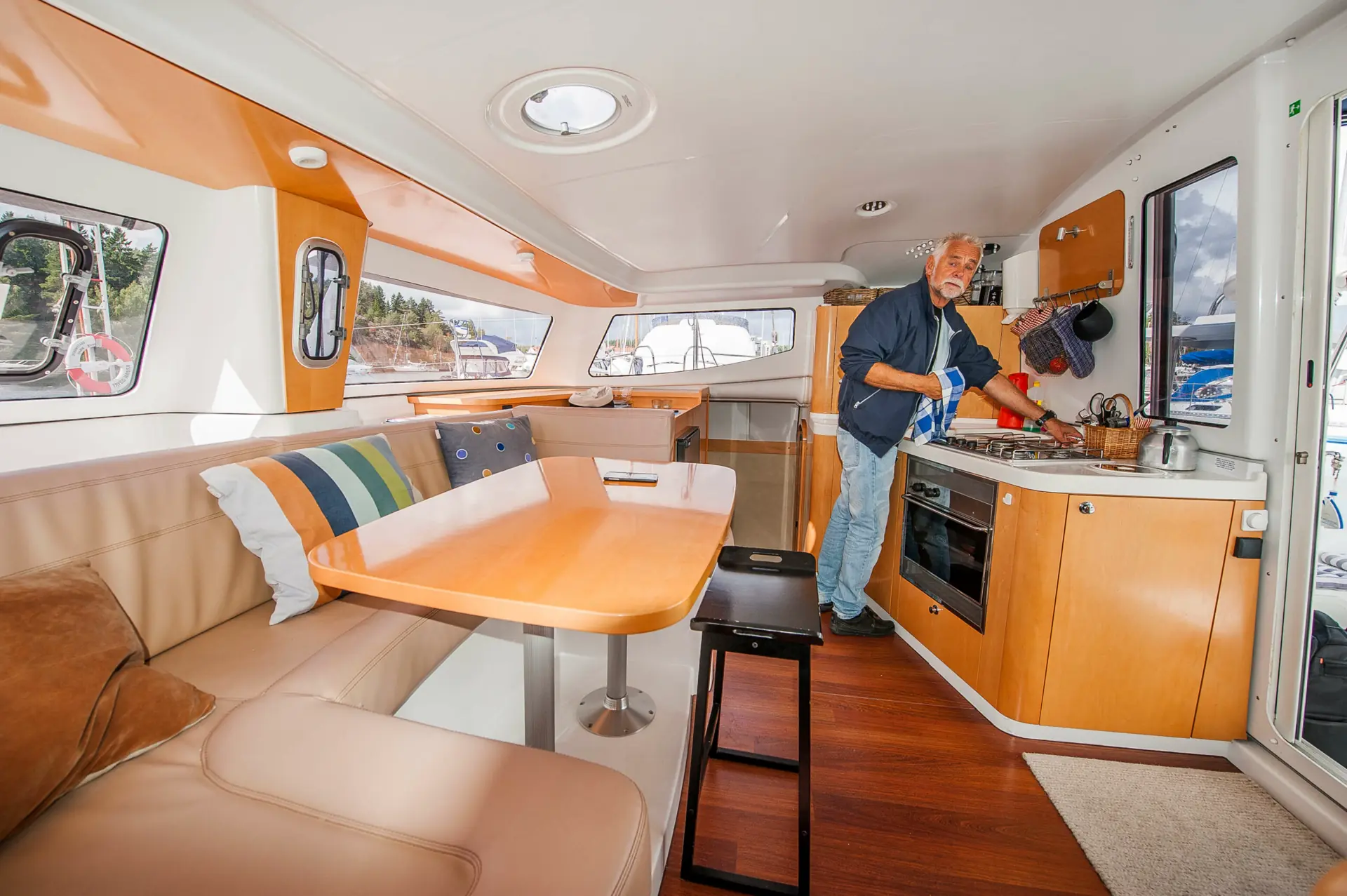 Ja, apropos det, en 20 hk Volvo dieselmotor i hvert skrog gir den 5.90 meter brede båten en marsjfart på 7.5 knop. Når den ikke stikker dypere enn 1.20, er det mulig å ankre opp farkosten på steder litt utenfor allfarvei, noe som gir oss stadig ny utsikt fra ”hyttevinduene”. Seil, motor og hytte – i ett, altså!