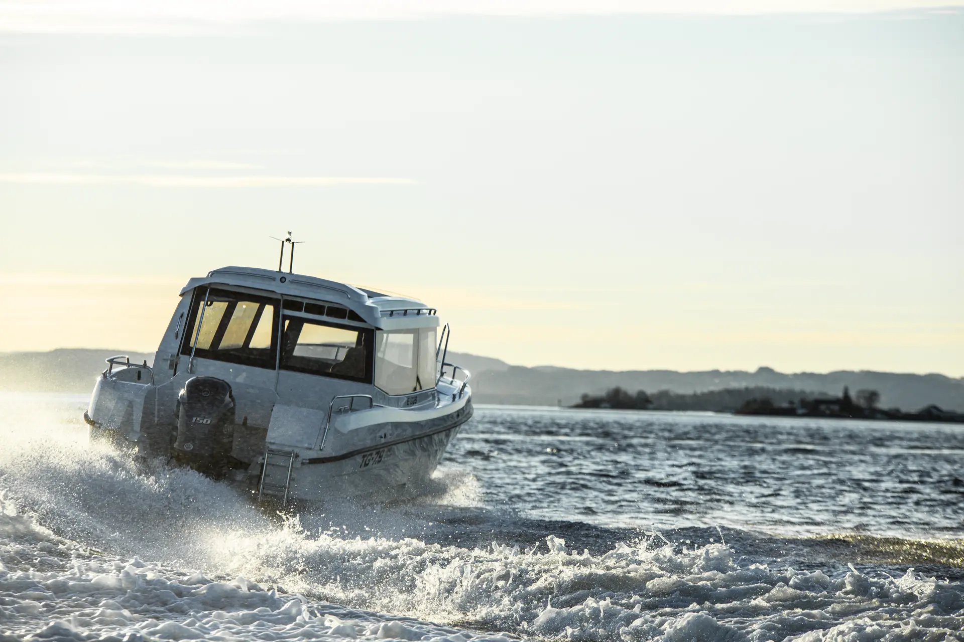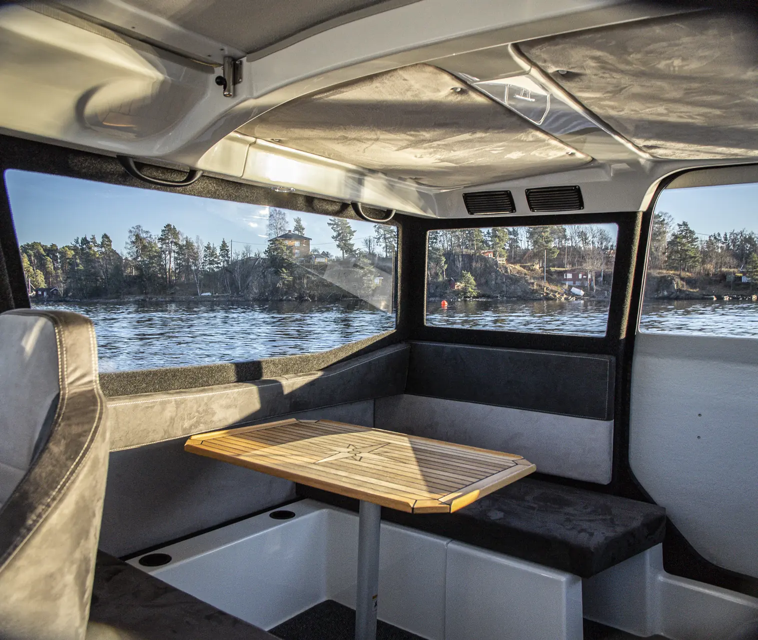 Det er en positiv og nokså viktig detalj for en transportbåt, i tillegg til at de store vinduene gir mye lys. Også her er det store rom under benkene for bager og annet – og under sofabenken kunne det nesten vært overnattingsplass for en person. Du kan også få en bysseseksjon i hytta, med vask og kokebluss ved å flippe passasjersetet frem. Under førerstolen finnes kjøleskap.