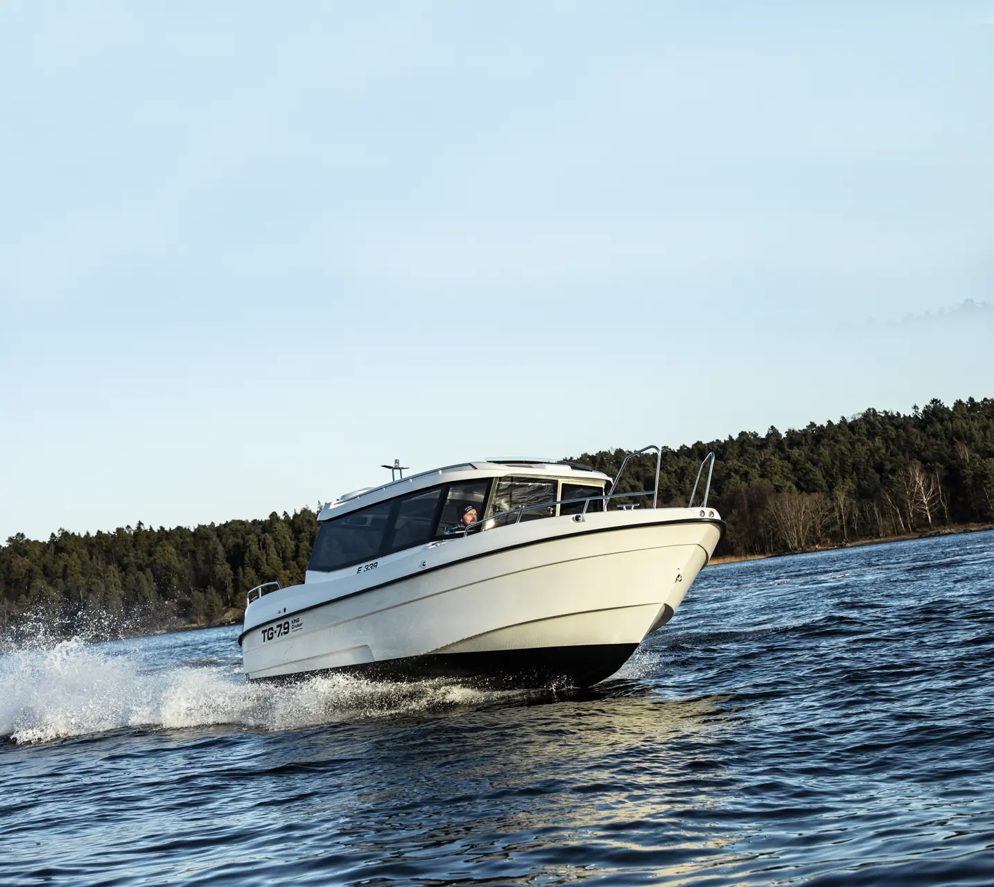 Hytta fremstår som enkel, men funksjonelt innredet. Noe av det mest imponerende er imidlertidig førerposisjonen – som er noe av det bedre vi har sett på styrhusbåter i dette segmentet. Den er midtstilt, har en enorm sidestøtte med gasspak, koppholder og andre instrumenter som baugpropell og trimflaps. I tillegg har det blitt plass til et riktig stort rom ut mot skutesiden. Sikten fra posisjonen er upåklagelig, og om vi skal være skeptiske til noe, så må det være plasseringen av kartplotteren på 9 tommer til høyre for rattet – men etter å ha kjørt båten noen timer blir vi godt vant til plasseringen, som faktisk oppleves som ganske hensiktsmessig.