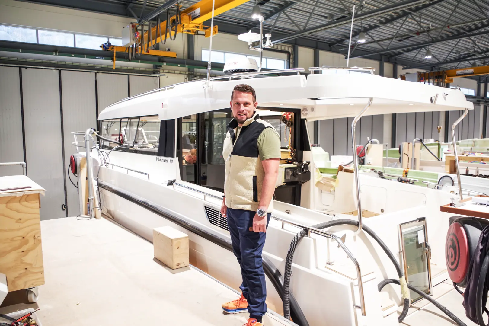Ja, Kristian Sivertsen, daglig leder hos den norske båtbyggeren, blir svett bare med tanken på alt som skal gjøres, i tillegg til den daglige produksjonen, og alt annet som er nødvendig drift på en fabrikk med over 80 ansatte. Vi er på besøk i midten av november, og Sivertsen forteller at de skal stille ut tre båter i januar på den tyske båtmessen, og en av dem har de akkurat startet monteringsarbeidene på. Det er selve stjernen, Viknes 10, som er nominert til den gjeve prisen European Powerboat of the Year 2025.