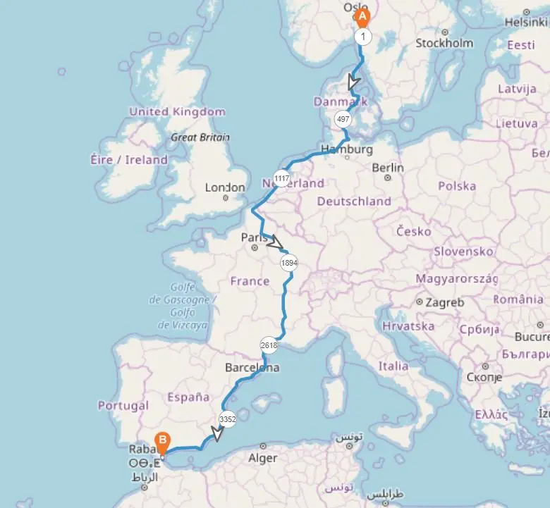 Vi kommer til slutt ved utløpet av elven Rhône og ut i Middelhavet helt sør i Frankrike. Videre kommer vi til å ro vestover langs Spania helt til vi kommer til Gibraltarstredet. Den siste krysningen blir da over til Marokko i Nord-Afrika."