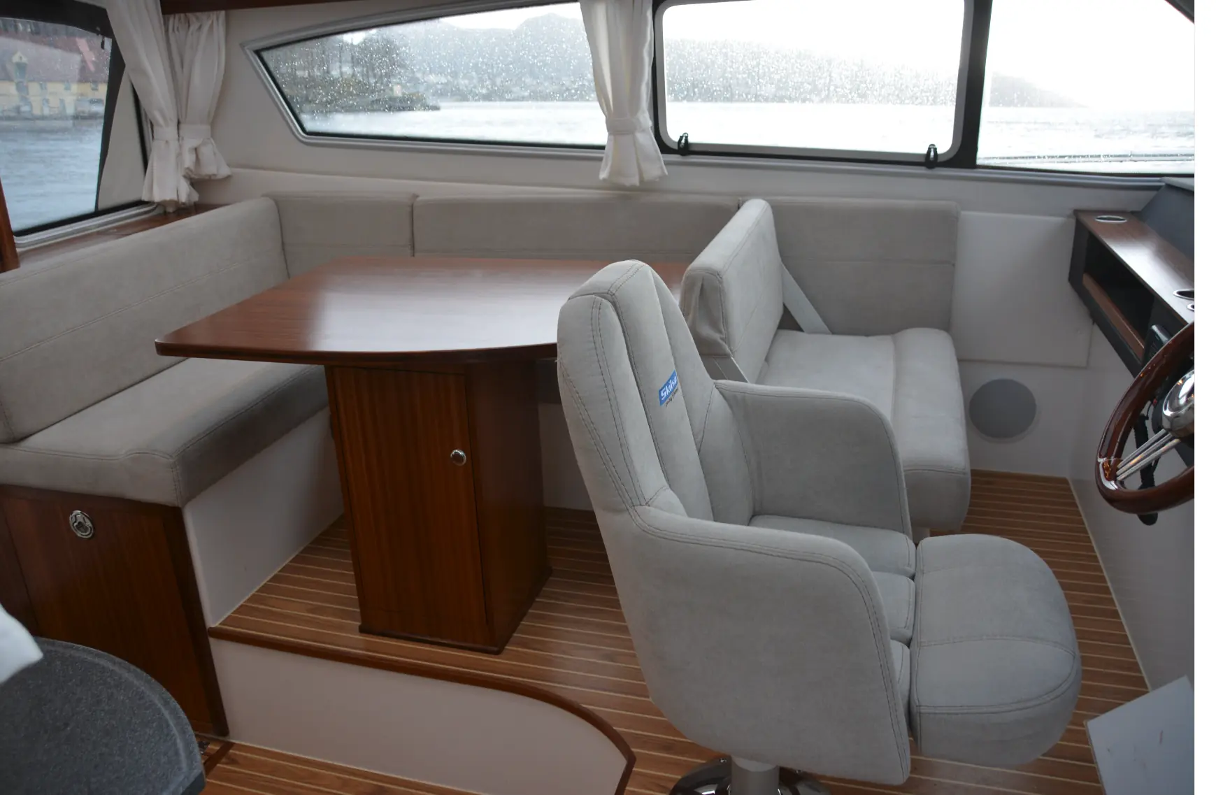 Totalt får seks personer plass rundt det store salongbordet, og det er god utsikt til alle kanter, også frem utover dekk, for alle som sitter her. Legg for eksempel merke til vinduet mot akterdekket – som gir både passasjerer og fører ekstra sikt akterover.