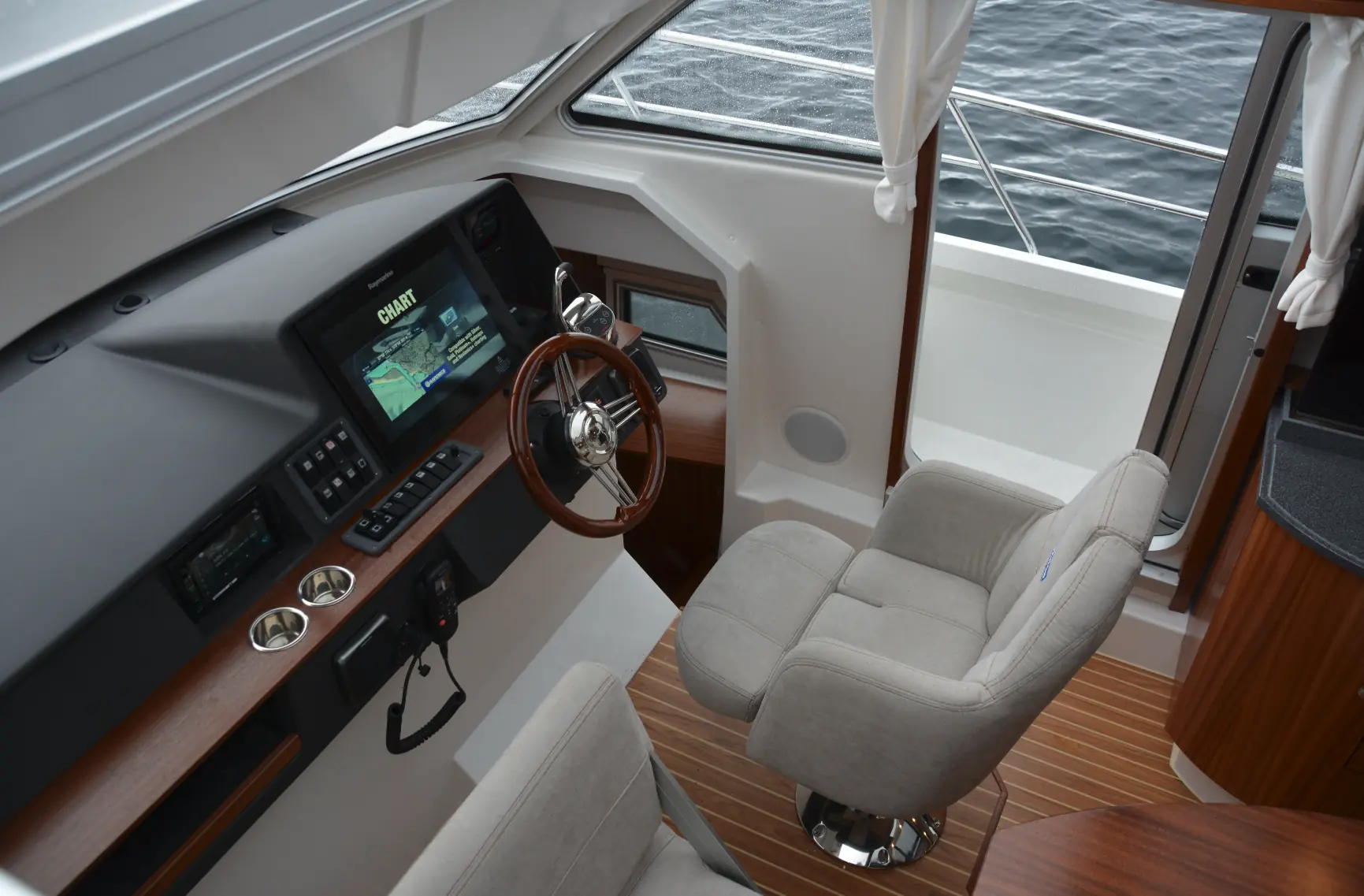 Treverket over hele båten er i mahogni, men det er fortsatt lyst og luftig i salongen med store vinduer i sidene og frem på dekk, samt to store takluker – hvorav den ene er elektrisk – utviklet av Sørlandsbaserte Ertec - og slipper inn mye luft. Takket være midtstilt førersete og nedfelte dollbord på styrbord side er det også blitt plass til en praktisk skyvedør – også denne nyutviklet av Ertec - for enklere adkomst.