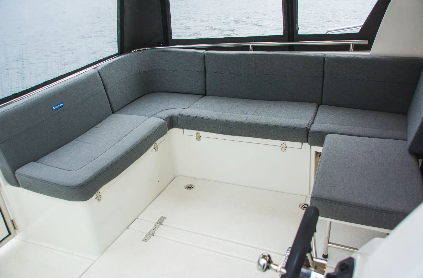Skilsø 34 er en lukket båt uten flybridge med elektrisk skyvetak med dobbel duk og kalesje over akterdekket. Denne er innredet med buesofa for fem – seks personer og godt med stuveplass under benkene. Mange er vant med at putene må av når man skal åpne disse, men her har Skilsø valgt å plassere hengslene foran – en smart og praktisk detalj. Det er også utendørs styreposisjon med i standardutrustningen og rom i sidene for gass, landstrøm og vått tøy. Med kalesje og egen «port» ut til det nedfelte dollbordet på styrbord side blir dette et lunt akterdekk – som med kalesjeveggene og skyvetaket kan tilpasses de ulike værforholdene man har.