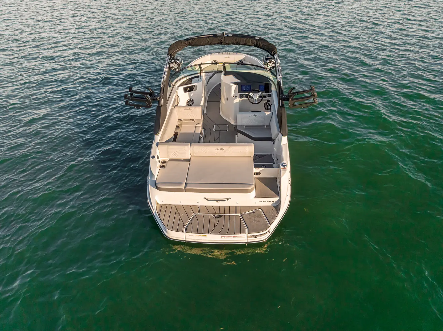 Systemet inkluderer over 450 kg ballast, elektriske surftabber og Active Trim, og styres via Mercury Smart Tow med Sea Rays eget surfgrensesnitt. Her kan brukeren velge mellom tre forhåndsinnstilte aktivitetsmodus. Som standard leveres båten med to 9-tommers Simrad NSX-multifunksjonsskjermer.