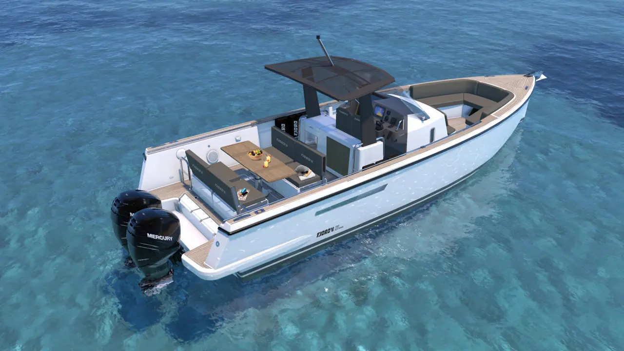 I kjent, ny Fjord-stil snakker vi naturligvis om en stor og luftig uteplass for varme og solrike dager på sjøen – som gjør denne båten til en stor, åpen skjærgårdsjeep. Med sine 36 fot er det også blitt plass til en kabin under dekk for to personer, samt bad med dusj.