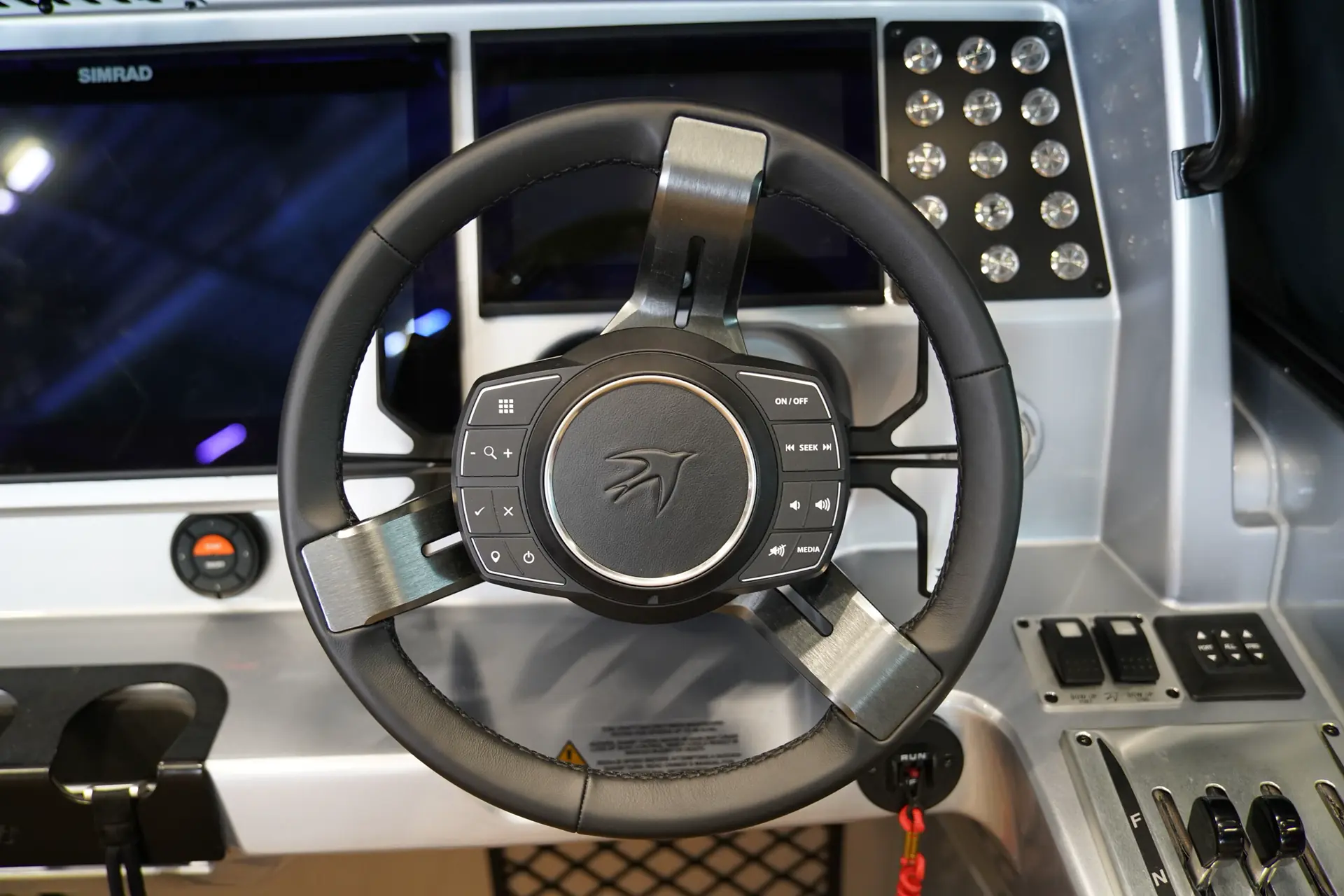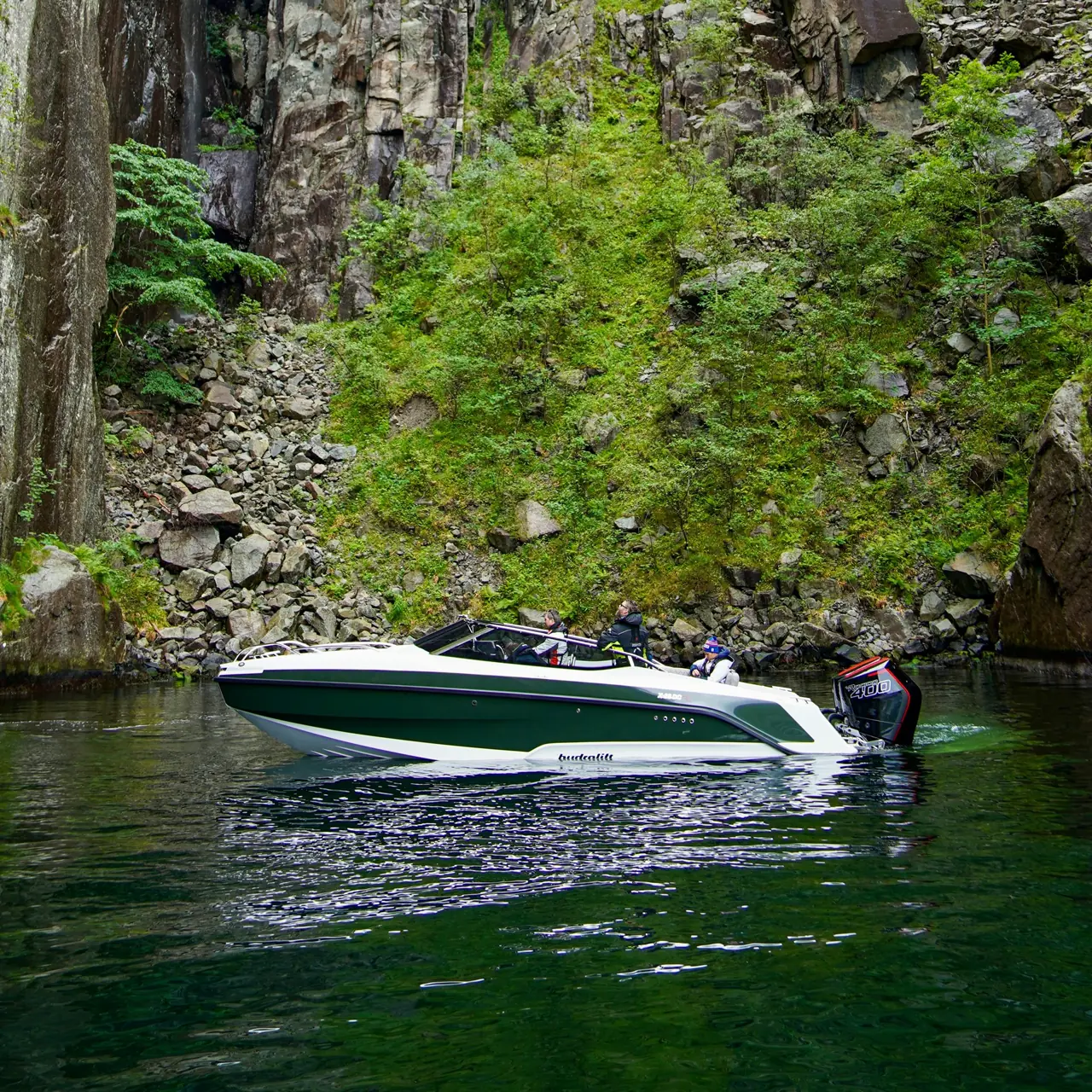 Det er mye for en sosial og familievennlig båt med overnattingsmuligheter under dekk, eget bad med dusj og solseng. Den har tre separate stoler i fartsretning og en stor U-sofa med tilhørende bord akter. Og kjenner vi designeren bak - Bård Eker og Eker Design - har garantert også denne båten noen spennende og praktiske løsninger å by på.