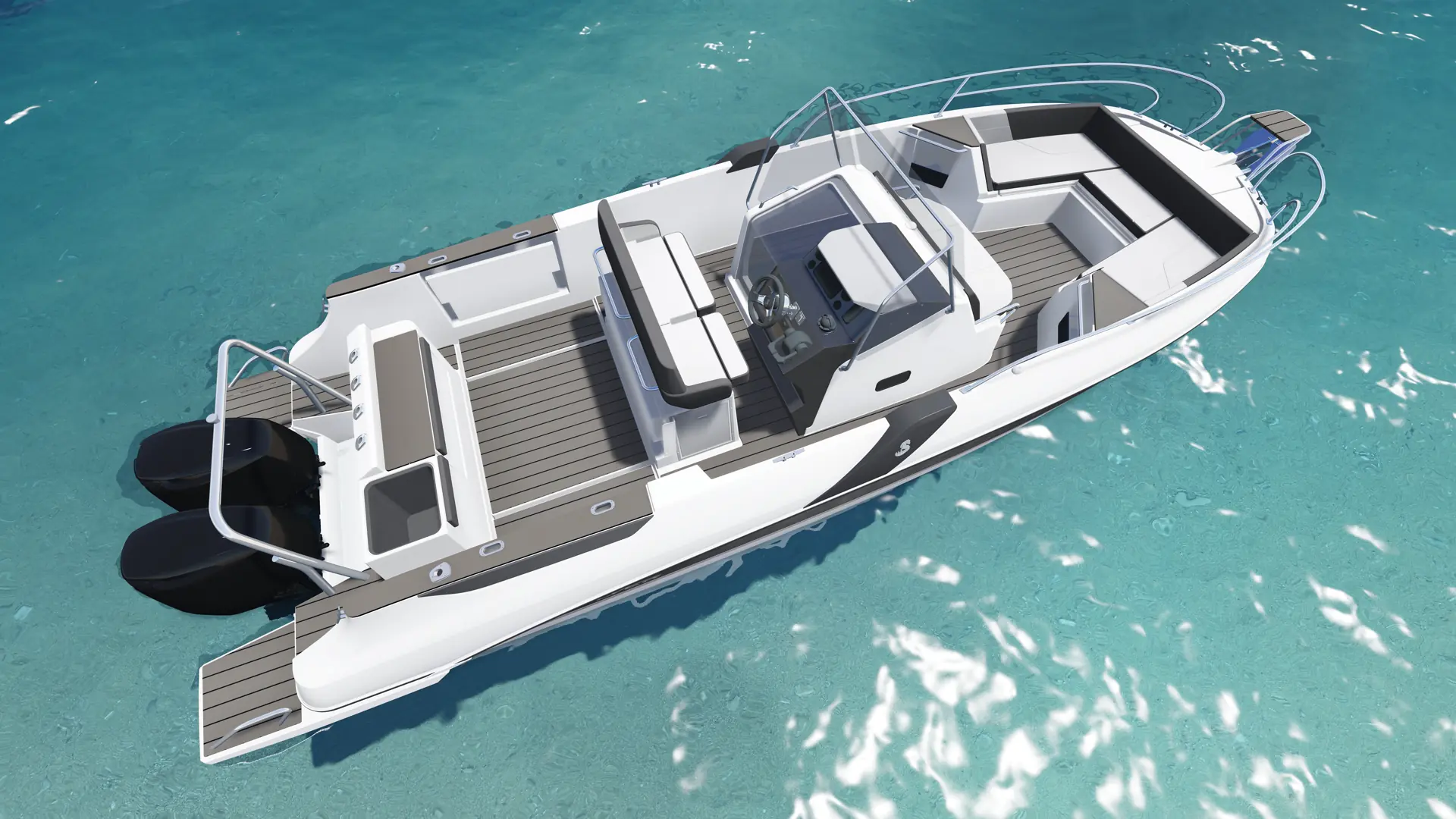 8.8 Sundeck blir en stor skjærgårdsjeep med bredde på 2,89 meter nesten helt frem til baugen. Selve planløsningen er ganske tradisjonell, med sofabenk akterut, førerplassss for to - tre personer og en U-sofa forut i baugen - som selvfølgelig kan gjøres om til solseng. Det er brukt brune og hvite farger på tekstiler for å få frem et eksklusivt preg.