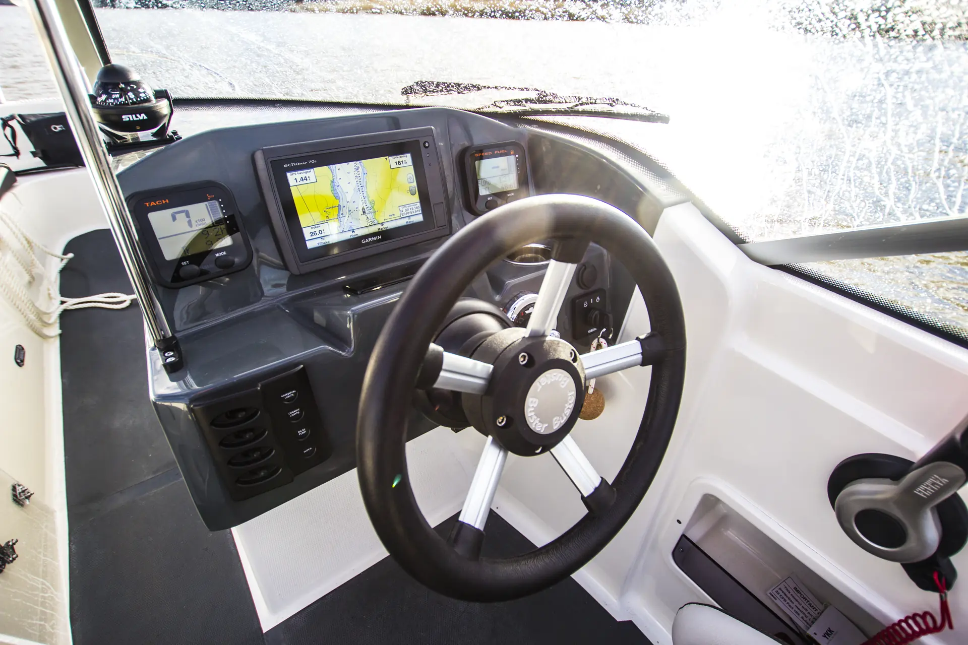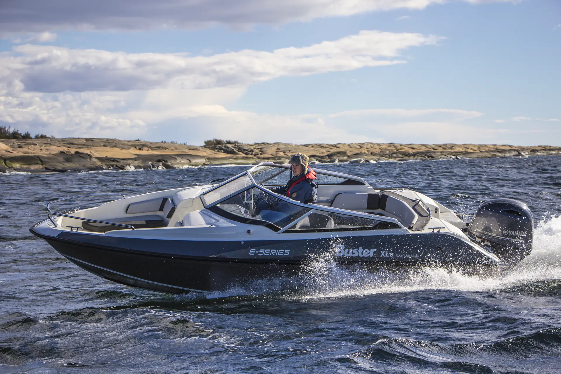 Blant annet er skroget fortsatt basert på velkjente Buster XL. Kjøreopplevelsen er selvfølgelig noe mindre sportslig sammenliknet med XL som følge av noe mer tyngde, og derfor har skroget fått steglister, noe som blant annet gir en planingsterskel på rundt tolv knop. Vi har hatt Convertible på test i flere uker og fått testet skroget i de fleste sjø- og vindforhold. Her har Buster utviklet en båt som både har sportsligheten på plass, men som samtidig føles trygg å kjøre. Sittestillingen er noe lav, slik at vindskjermen tar unna for vind, men takket være setet er det også mulig å sitte høyere å føre båten. Herfra har man full kontroll, og i kjent Buster-stil er instrumenter, gass/gir og ratt ergonomisk plassert i forhold til hverandre.