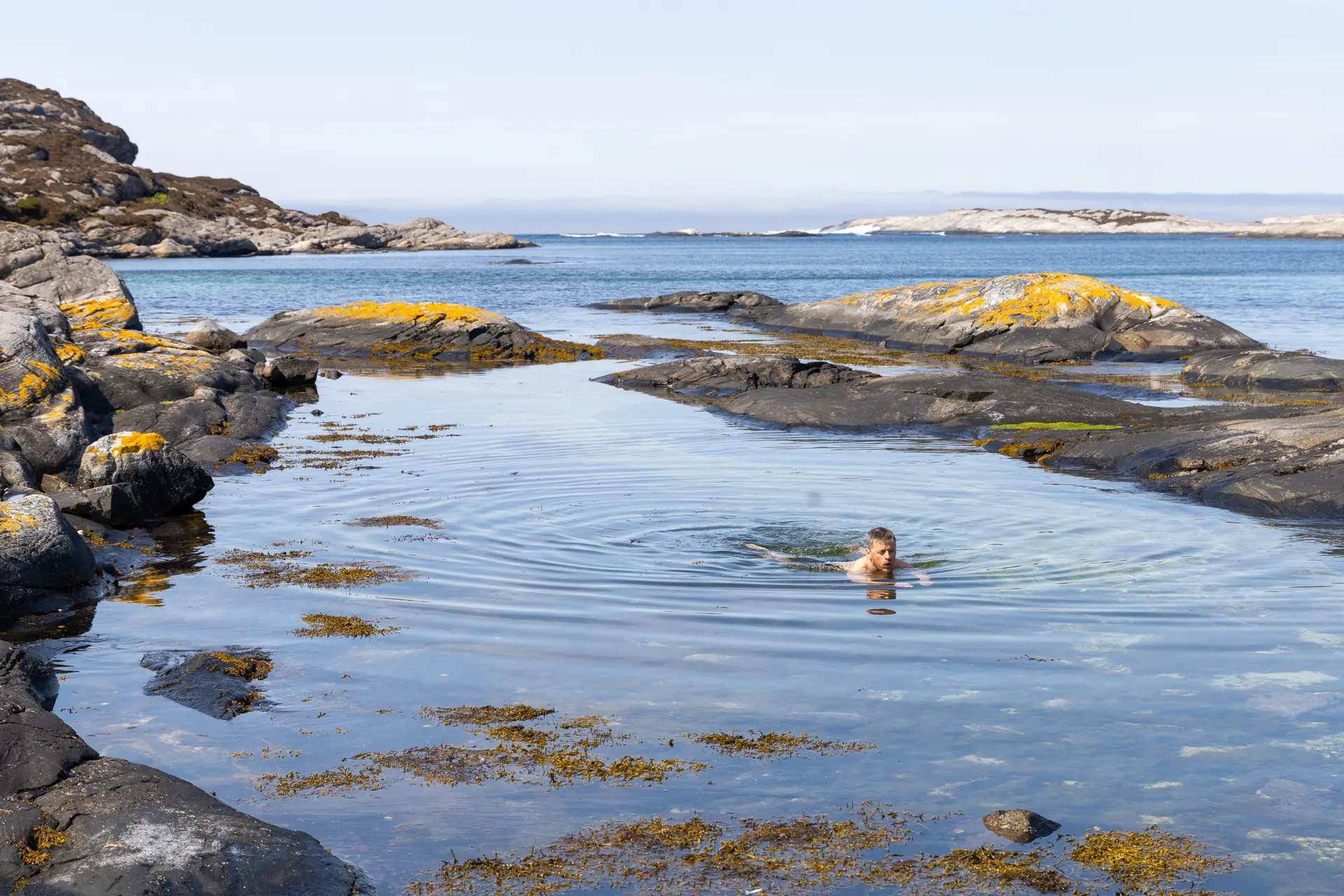 Den grå dynen som har hvilt over oss gjennom formiddagen trekkes plutselig tilbake og solen titter frem. Det er mai, fortsatt kaldt i vannet, men det frister med et vårbad.