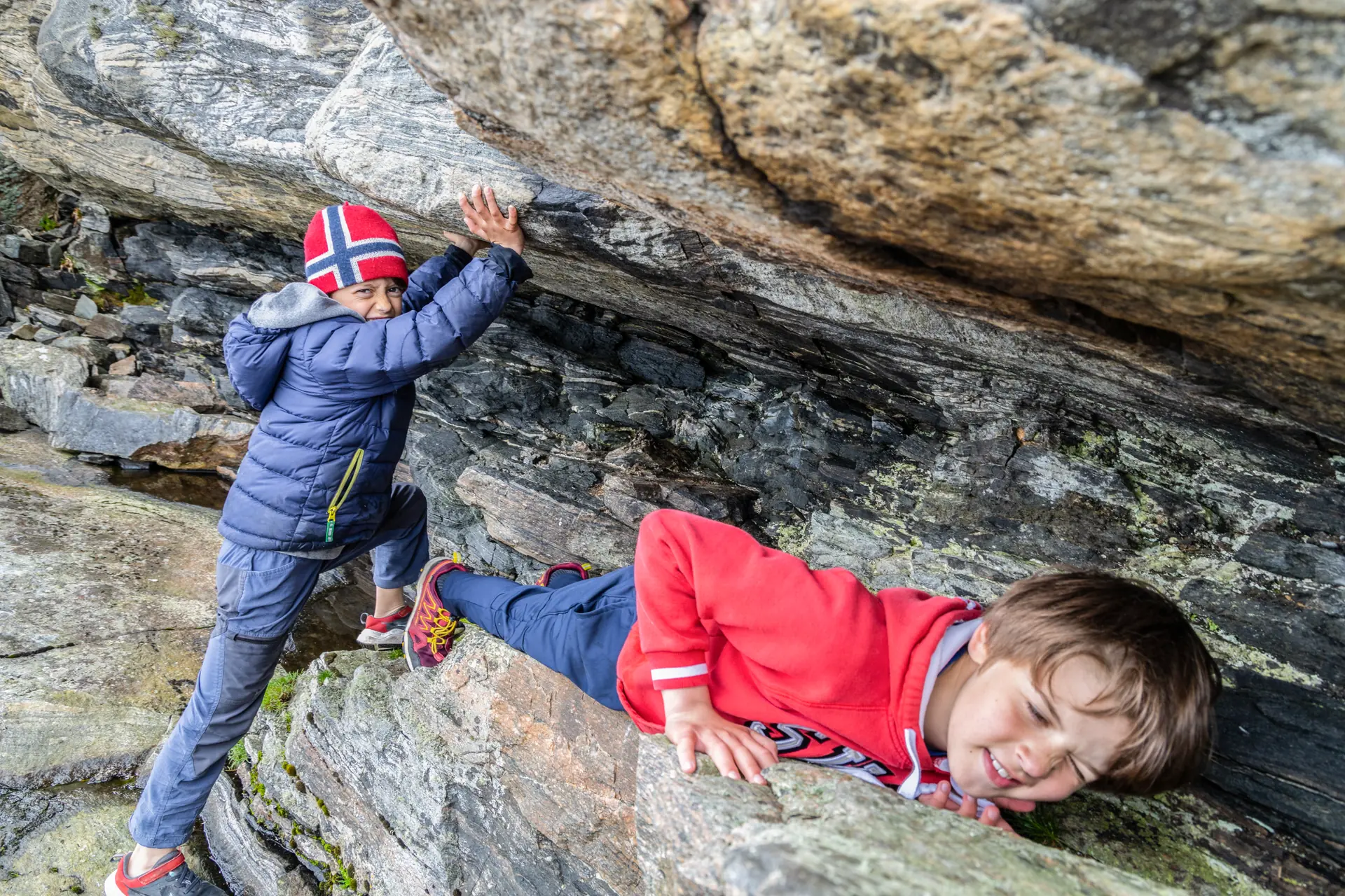 Men hvor er Willem og vennen hans Tomas blitt av? Vi kikker rundt. Plutselig oppdager vi to par med føtter som stikker frem fra en bergsprekk. De har funnet det perfekte skjulested.