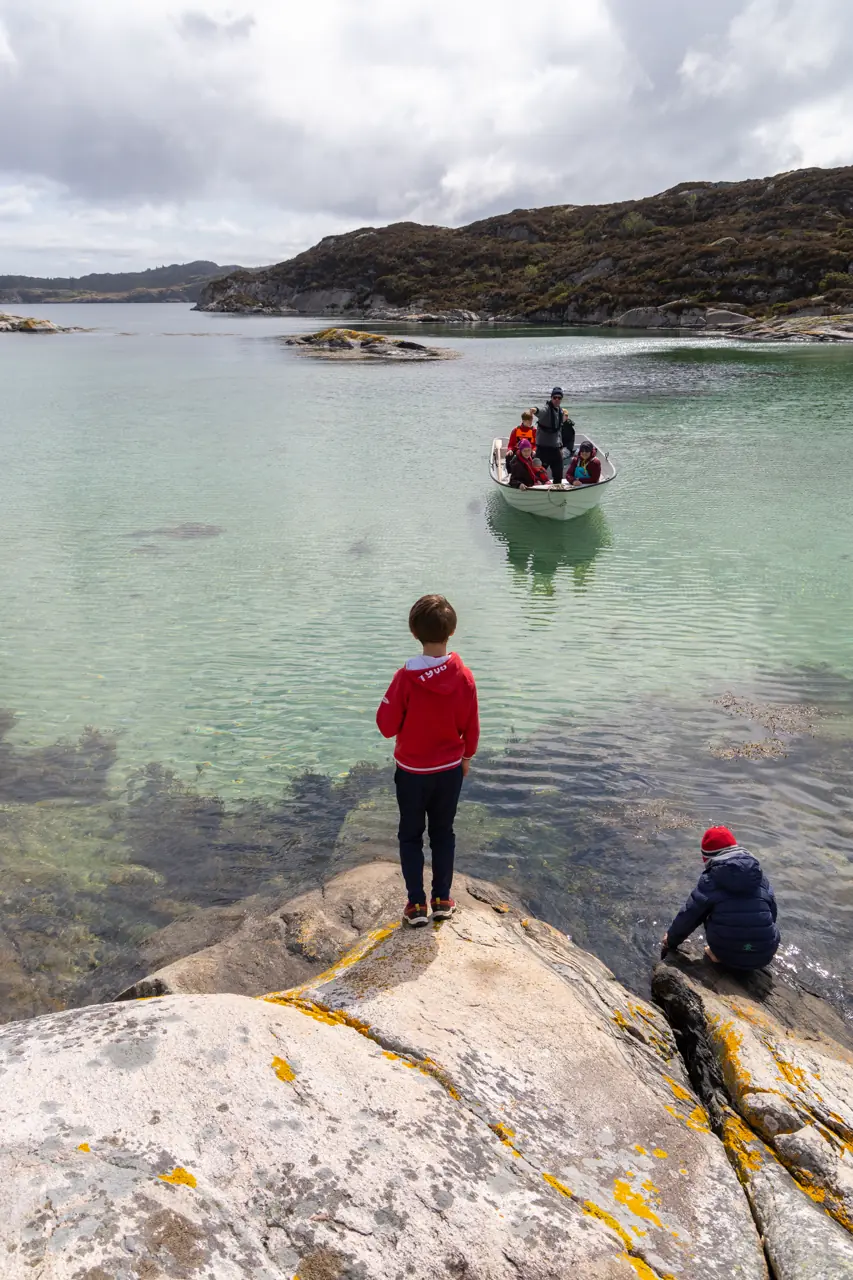 Willem legger båten rolig inn til svaberget. Lyder (11) hopper i land og surrer tauet rundt en stein.