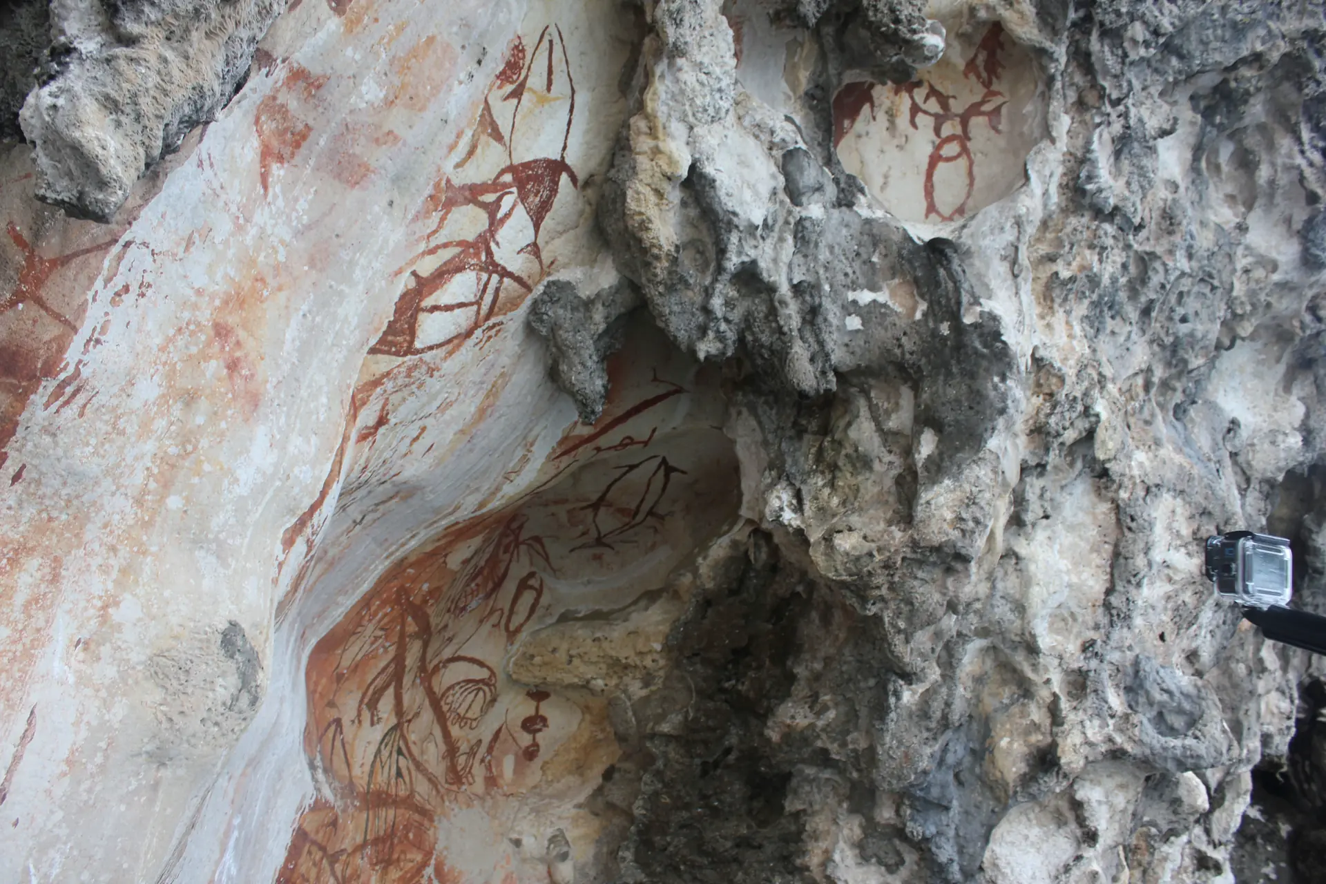 Å ankre opp her var igjen litt av en utfordring. Øyene er ganske bratte og veggene stuper rett ned i det 30 meter dype vannet. Det var nettopp dette vi hadde kjøpt de lange nylontauene til, som vi hadde brukt til ankring på rangerstasjonen. Elevene ble sendt ut med jolla, der de festa tauene til et lite tre i fjellveggen. Voila, straks lå vi like trygt som om vi skulle vært i havn. Forskjellen var at vi lå midt i et eventyrlandskap som vi hadde helt for oss selv og kunne bruke to hele dager på å utforske. Vi oppdaget grotter store nok til å kjøre inn med jolla mens flaggermusene sirklet rundt hodene våre, og en utsiktsplattform med panorama over hele området. Og til slutt en vegg full av gamle malerier – så gamle at et nytt lag av stein hadde begynte å legge seg over bildene av fisker, hender, mennesker og rare farkoster.