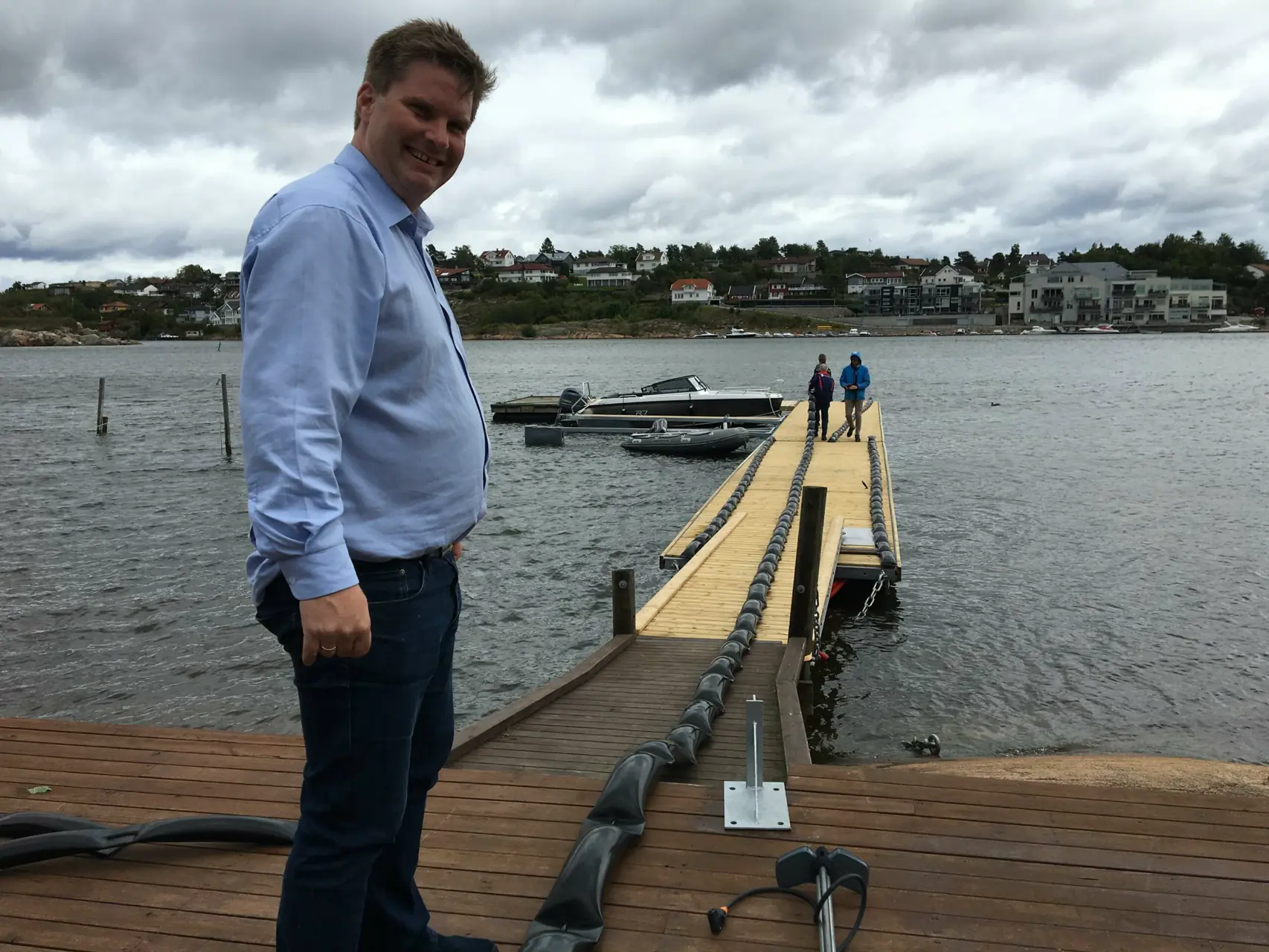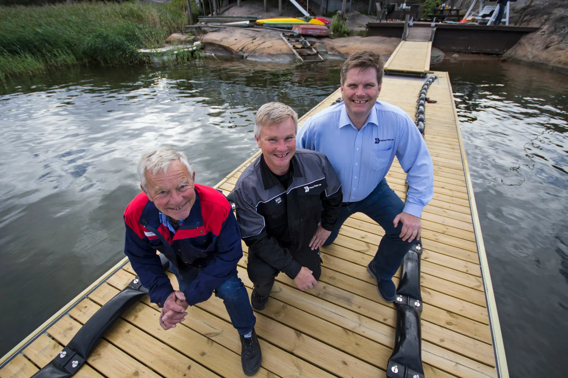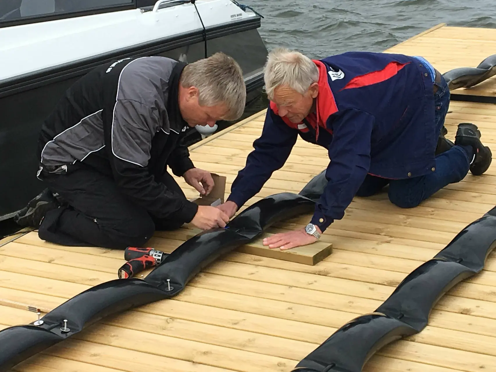 Selve fremgangsmåten, og utstyret som trengs, avhenger av om fenderne skal monters på utriggere med strips eller til brygge/kai med skruer. Vi skal montere ParmaFender XL på longsideplasser langs flytebryggen og L-fenderen på utriggere. Til å vise oss hvordan dette gjøres, har vi fått besøk av familien Parmann representert ved daglig leder og oppfinner Georg, partner og markedssjef Jan Hendrik og gründer Gunnar.