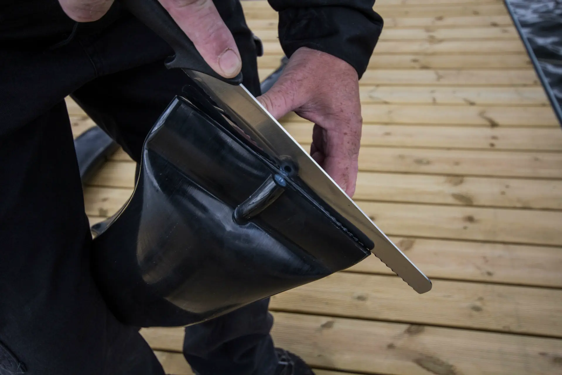 For utriggere brukes gjerne sterke stålbånd. Disse kunne Parmann presentere i fjor, da det ble brukt plaststrips tidligere. Stålbåndene kjøpes av Parma Plast, sammen med en underlagsprofil – «plastbånd» - for å unngå spenningskorrosjon og gnag. Også her er fremgangsmåten enkel. Først bores det hull for stålbåndet i monteringsflaten på fenderen og avstanden mellom hullene tilsvarer bommens høyde. Deretter festes fenderlenken midlertidig til utriggeren med stropper eller liknende. Når den ligger riktig er det klar for stripsing! Ved montering med stålbånd trenger du en hammer – gjerne med plasthode, et strammeverktøy og noen stropper, strips eller liknende. Og når Parmafenderen er kommet på plass – kan du gjøre det som både Parmann og undertegnede er enige om er det beste i hele prosessen… Nemlig å pumpe opp lenka til ett bar trykk.