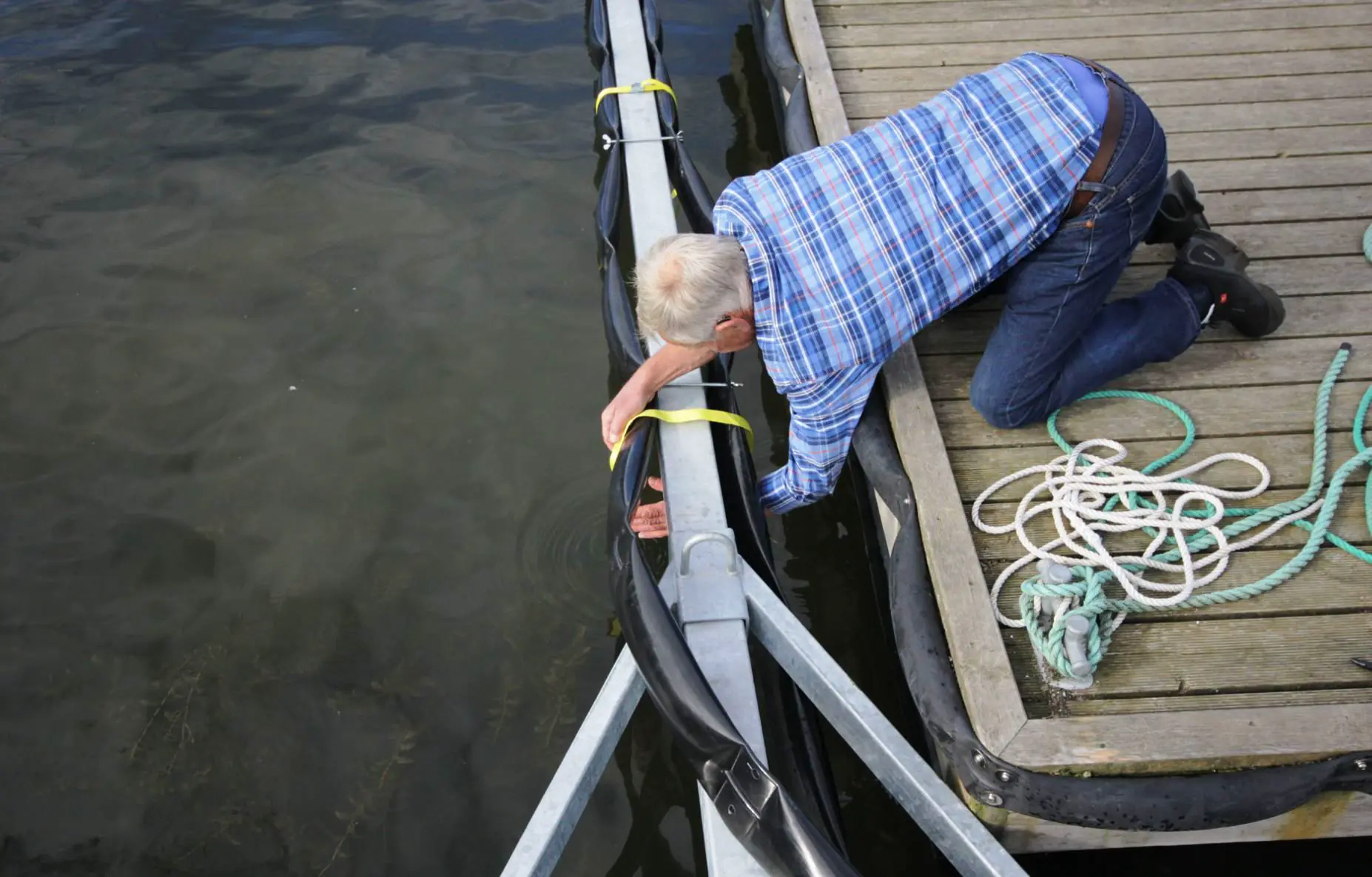 Nå første gulltips – fest alle skruer og skiver på forhånd, før fenderne monteres til brygga! Det sparte i alle fall oss for både skruer fra å bli mistet i sjøen og tid. Fenderlenka festes med to skruer per element, og her kommer neste monteringstips. – Fest en skrue øverst i enden, og så en øverst i andre enden. Ta så midten, og midten og midten. Da blir det enkelt å justere fenderne riktig underveis også, slik at du unngår å sitte med for mye eller lite fender i hånda i den andre enden… Når fenderremsa er på plass, pumpes den opp med luft til cirka 1 bar – og vips – så er longsideplassen fendret.