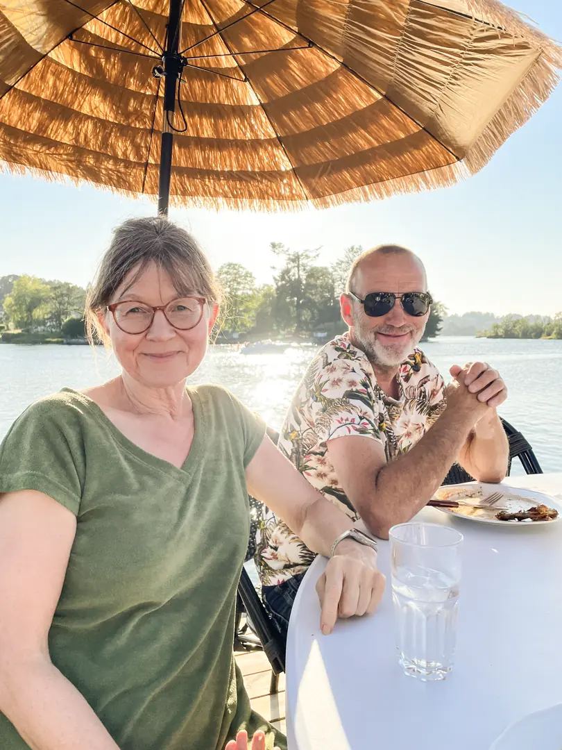 Middagen denne kvelden skulle inntas på Nidelven Camping. Følget, som nå var blitt syv stykker i det bror til undertegnede med sommerhus her nede ble invitert med, tok sjøveien til dette smått legendariske stedet. Alle som ikke har gjestet denne perlen av et sted, er herved anbefalt å gjøre det. Campingen og bordene til uteserveringen er helt i vannkanten og stråparasoller plassert rundt i spiseområdet gir en litt syden-aktig følelse.