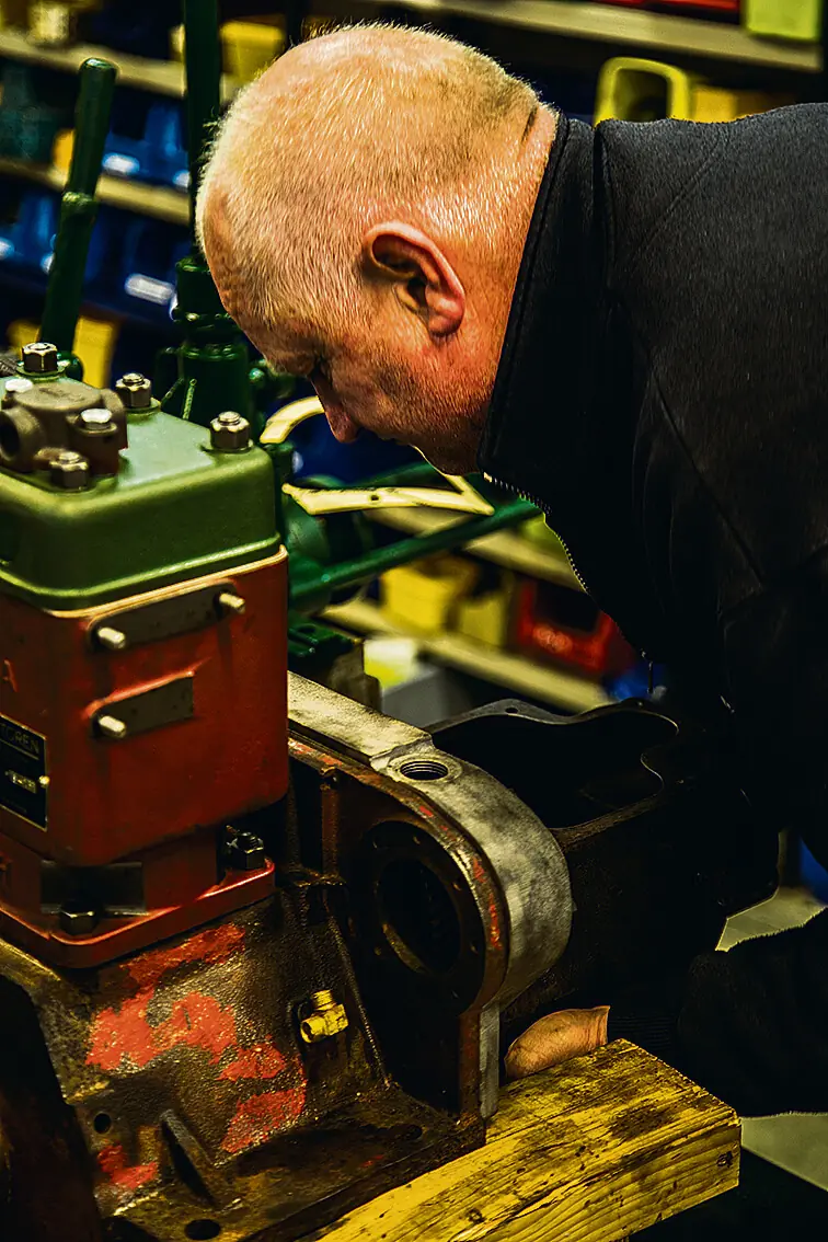 Nå har han cirka 800 kvadratmeter over to etasjer til disposisjon, og bare det å gå gjennom lokalene er en opplevelse i seg selv. Her har Petter «Mekker’n», som han av mange blir kalt, klart å kombinere hobby og jobb. Det innebærer blant annet et lite museum med over tyve motorer av ymse slag og årsmodeller til utstilling – og et tyvetalls til venter på å få komme opp hit.