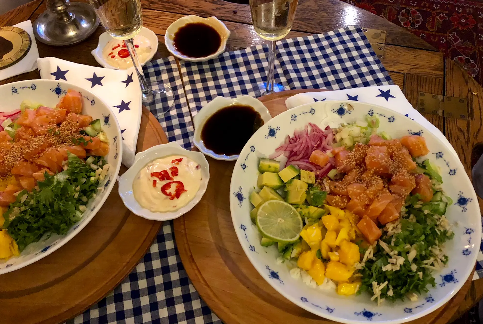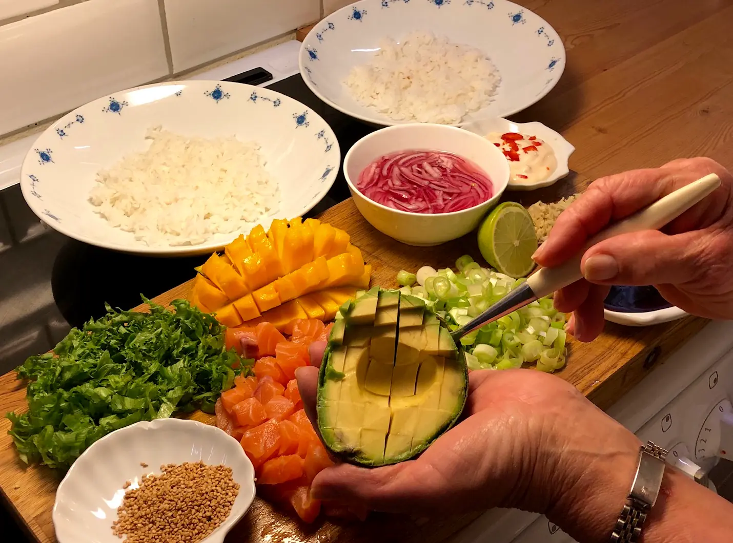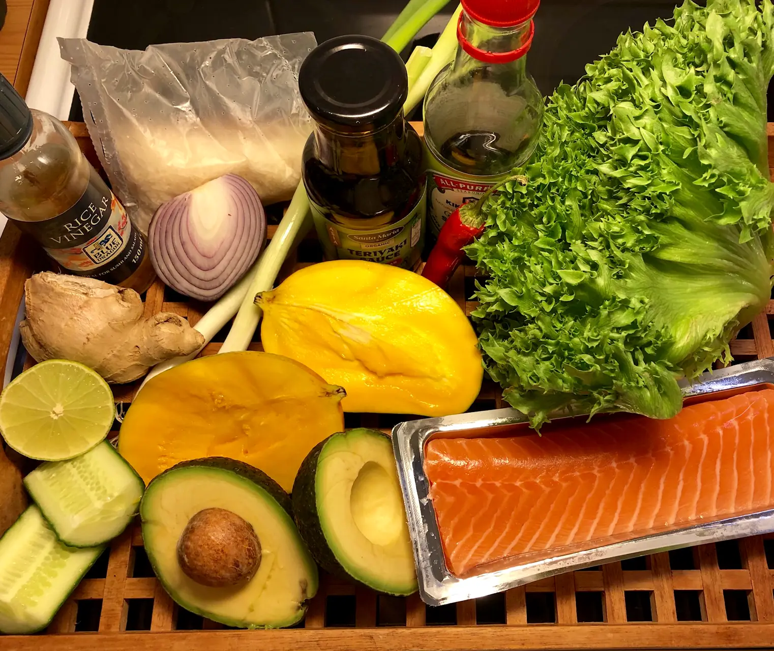 Laks er den vanligste hovedingrediensen, men om du kommer over ørret, kveite, tunfisk eller blekksprut, passer det også bra. Resten av tilbehøret varierer du etter hva du har og synes passer sammen. Bare fantasien setter grensen. Det blir fristende med grønnsaker med forskjellige farger. Et must er mango.