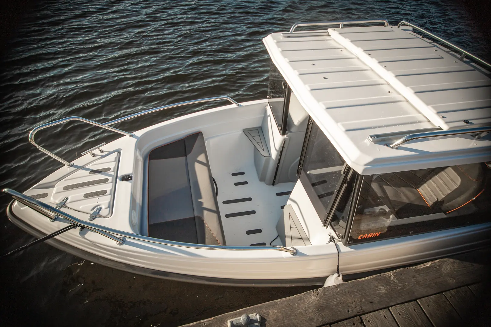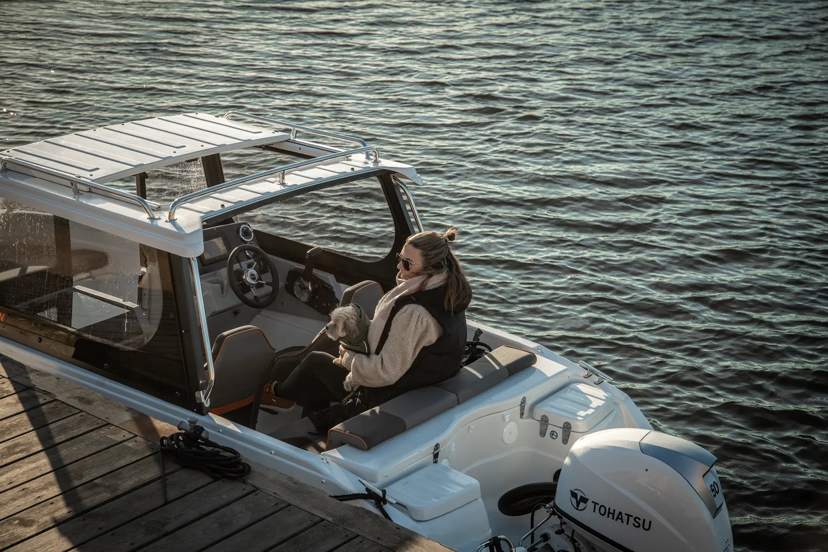 På varmere dager kan du åpne et stort soltak og både stå og kjøre, samt få inn lys og luft i kabinen. En stor kabindør gjør at du enkelt kan ta deg fra akter til baug.