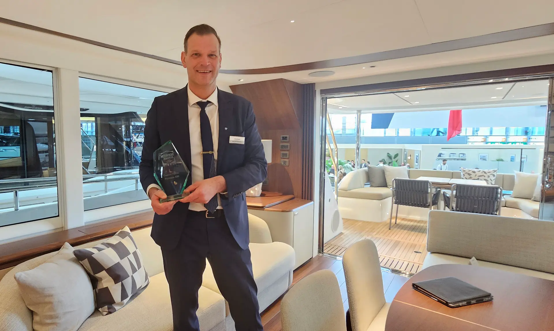 Gå vi opp til akterdekket er det godt beskyttet av den gedigne superflybridgen, som går over hele akterdekket og sidedekkene på hovedplan. Hele hoveddekket har walkaround, som lar deg gå trygt frem til baug. I baugen er en sitte anretning som kan være mer privat om en ønsker det.