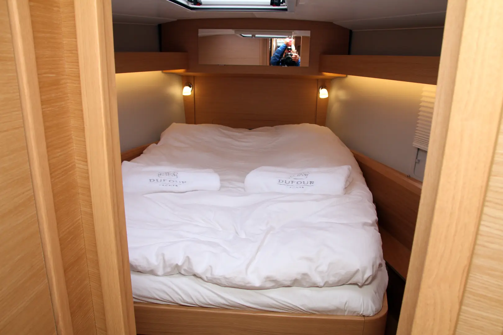 – Her er det mye oppholdsplass ute og inne som virker godt utnyttet. Testbåten har to flotte bad, flere smarte «vinkjellere» og en stor dobbeltseng i forpigg og romslige akterlugarer. Dette er en 43-foter som egner seg godt for en stor familie, forteller Sidsel og Arild.