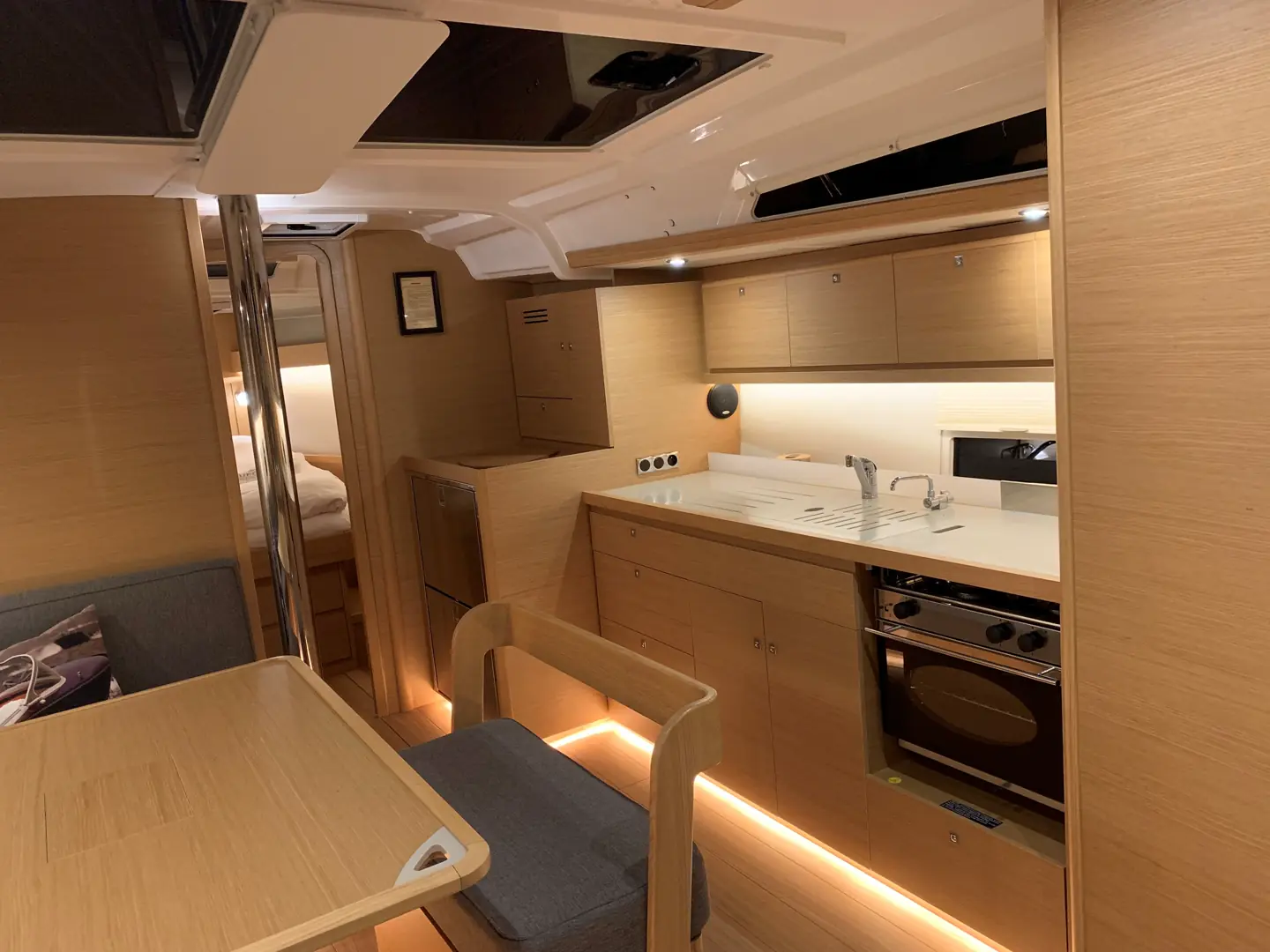 – Båten har en langsgående, god og lys bysse med veldig mye plass. Spesielt er jeg fornøyd med den gode hylla bak kjøkkenbenken ute i borde langs hele byssa. Praktisk med kjøleskuffer, den ene med stilig blått lys, samt praktisk skjæreplate over vasken. Med så mange skap og skuffer i byssa, kan du fint flotte deg med den innbyggede Nespresso-maskinen i en av dem. Den løse delen av benkeplaten over komfyren er god utnyttelse av plassen, og dette er noe flere båter burde benytte seg av. En slisse på siden der den felles ned gjør at området beskyttes mot søl.