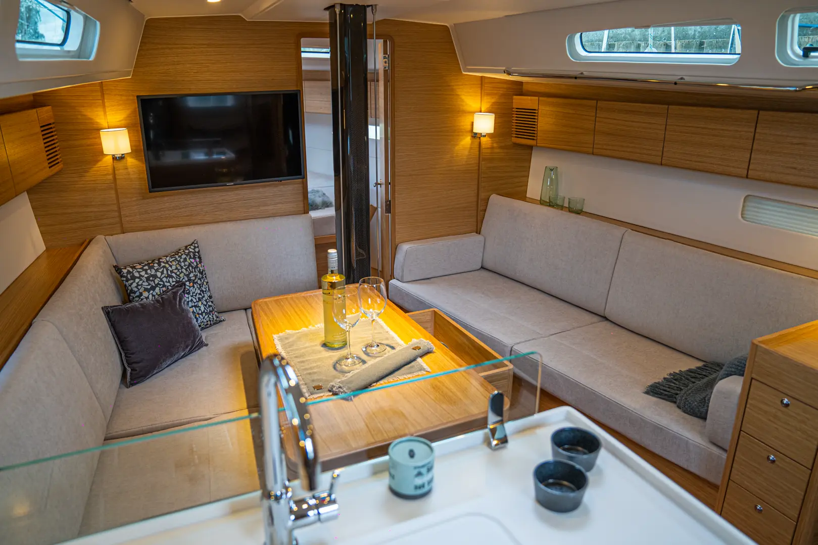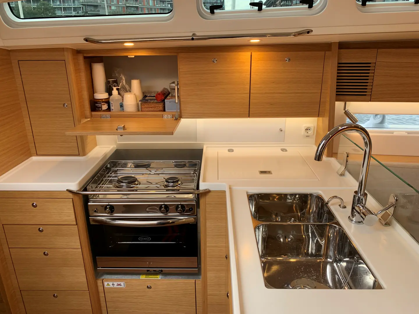Var det ikke noe å kritisere/forbedre? – Jo, jeg ville foretrukket høyere slingrekanter i byssa og på kartbordet, og jeg savnet slingrekant på badet. Jeg liker ikke vaskeservanten, for jeg ser for meg at i høy sjø tar jeg tak i den for å holde meg på bena, - og river servanten løs. Jeg er også usikker på om en slik «bolle»-servant holder vaskevannet på plass i sjøgang; smaker den litt for mye av design, spør Ellefsen. – Men, bevares, her kunne jeg glede meg over skikkelige skuffer til bestikk og bysseredskaper, stort stuverom under styrbord cockpitbenk og god dimensjon på vinsjene. Dessuten vet man at under den pene overflaten i plast- og trearbeider er det bygget inn styrke som tåler påkjenningen av en stram rigg.