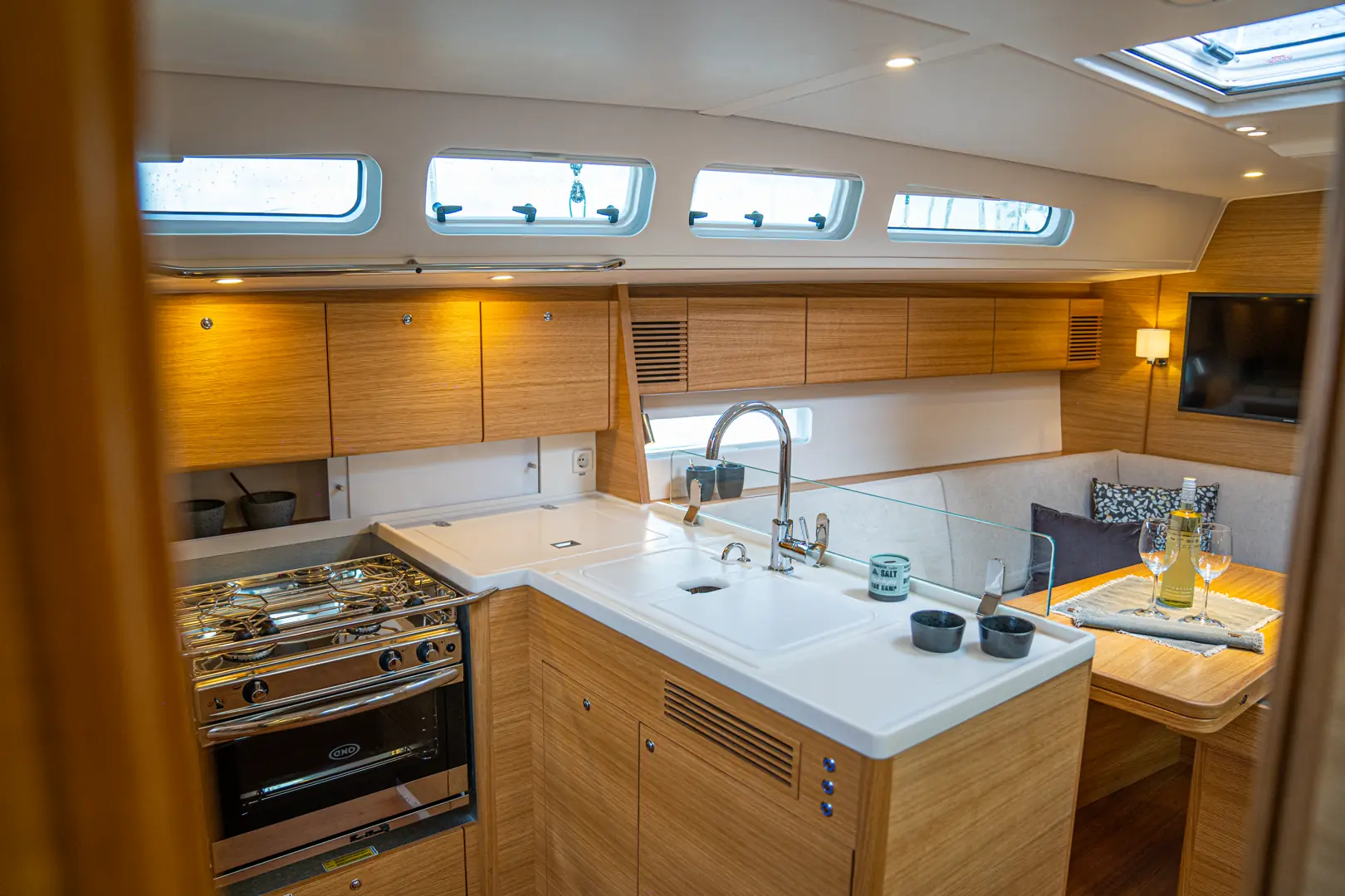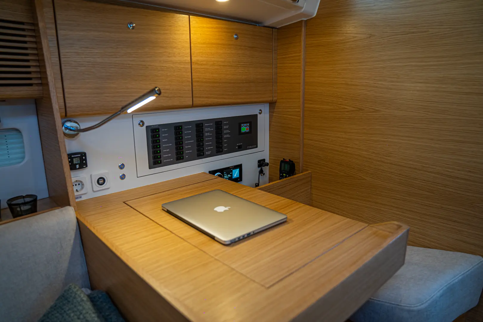 Båten er ikke helt standard. Verftet har selv valgt utstyret om bord: Karbonrigg fra Axxon, kick fra John Mast, superseil fra Elvstrøm. Hydraulisk akterstag og rod sidevant, gjør det hele stift. Standard båt koster 3 millioner kroner. Denne cirka 4. Slett ikke urimelig. Om vi gledet oss?